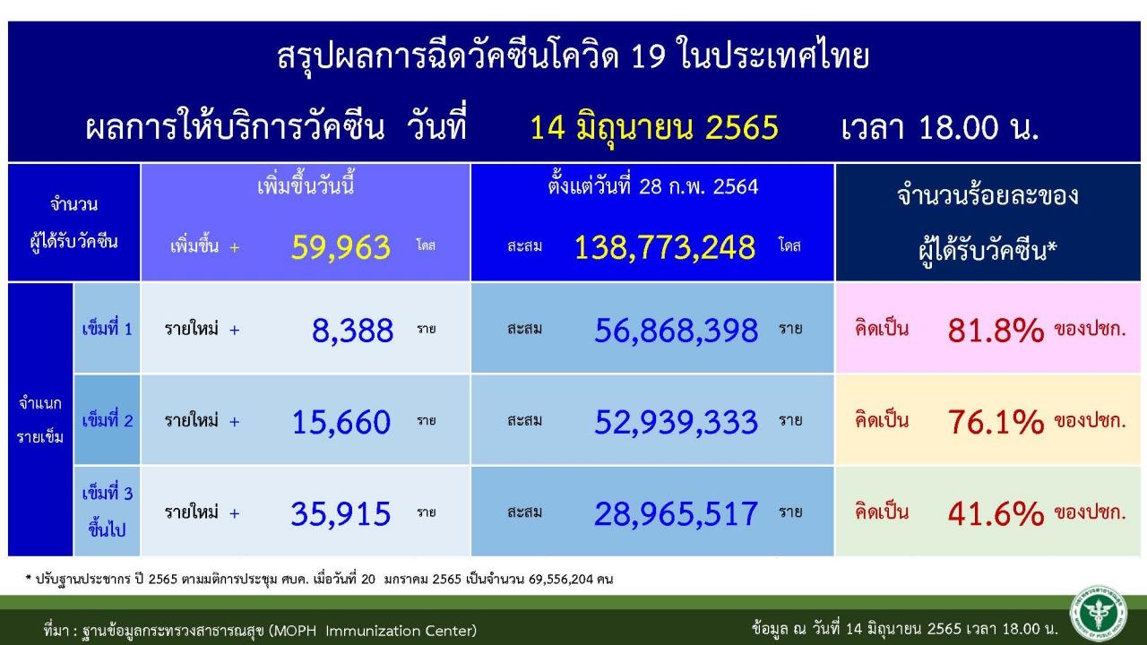 ข้อมูลการฉีดวัคซีนในภาพรวม ณ วันที่ 14 มิ.ย. 2565 เวลา 18.00 น. เพิ่มขึ้น 59,963 โดส