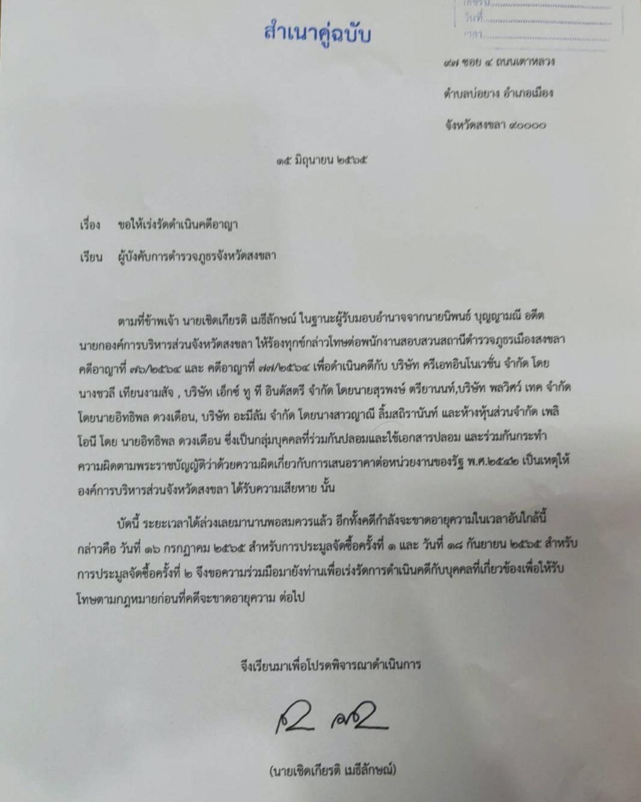 วันที่ 15 มิ.ย. นายเชิดเกียรติ เมธีลักษณ์ ที่ปรึกษานายกองค์การบริหารส่วนจังหวัดสงขลา เดินทางมายื่นหนังสือต่อ พล.ต.ต.อาซาน จันทร์ศิริ ผู้บังคับการตำรวจภูธรจังหวัดสงขลา ณ กองบังคับการตำรวจภูธร จังหวัดสงขลา อำเภอเมือง จังหวัดสงขลา เพื่อเร่งรัดดำเนินคดี ต่อพนักงานสอบสวนสงขลา ในคดีอาญาที่ 76/2564 และคดีอาญาที่ 77/2564 เพื่อให้เร่งดำเนินคดีที่เคยแจ้งความไว้แล้วกับ บริษัท ครีเอทอินโนเวชั่น จำกัด โดยนางชวลี เทียนงามสัจ บริษัท เอ็กซ์ ทู ที อินดัสตรี จำกัด โดยนายสุรพงษ์ ตรียานนท์ บริษัท พลวิศว์ เทค จำกัด โดยนายอิทธิพล ดวงเดือน บริษัท อะมีลัม จำกัด โดย น.ส.ญาณี ลิ้มสถิรานันท์ หรือ นางญาณี อารยะทรงศักดิ์ และห้างหุ้นส่วนจำกัด เพลิโอนี โดยนายอิทธิพล ดวงเดือน ซึ่งเป็นกลุ่มบุคคลที่ร่วมกันปลอมและใช้เอกสารปลอม และร่วมกันกระทำความผิดตาม พ.ร.บ.ว่าด้วยความผิดเกี่ยวกับการเสนอราคาต่อหน่วยงานของรัฐ พ.ศ. 2542 เป็นเหตุให้องค์การบริหารส่วนจังหวัดสงขลา ได้รับความเสียหาย เนื่องจากผู้มอบอำนาจมีความกังวลเรื่องของห้วงเวลาที่นานพอสมควรแล้ว อีกทั้งกำลังจะขาดอายุความ