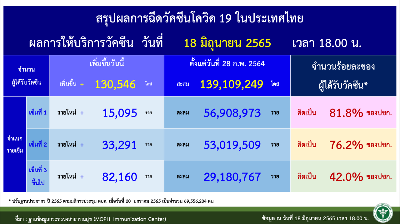 อัปเดตฉีดวัคซีนโควิด-19 ตั้งแต่ 28 ก.พ. 64 - 18 มิ.ย. 65 ยอดสะสมล่าสุด 139.1 ล้านโดส ขณะวานนี้ฉีดเพิ่ม 130,546 โดส สำหรับยอดเข็ม 3 ทั่วประเทศอยู่ที่ 42%