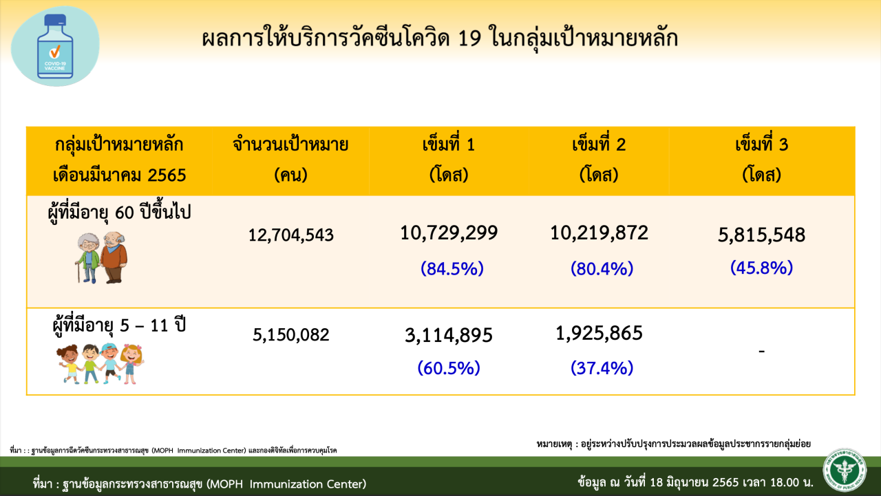 จำนวนผู้รับวัคซีนสะสม ตั้งแต่วันที่ 28 ก.พ. 2564 - 18 มิ.ย. 2565 (476 วัน) 139,109,249 โดส ในพื้นที่ 77 จังหวัด