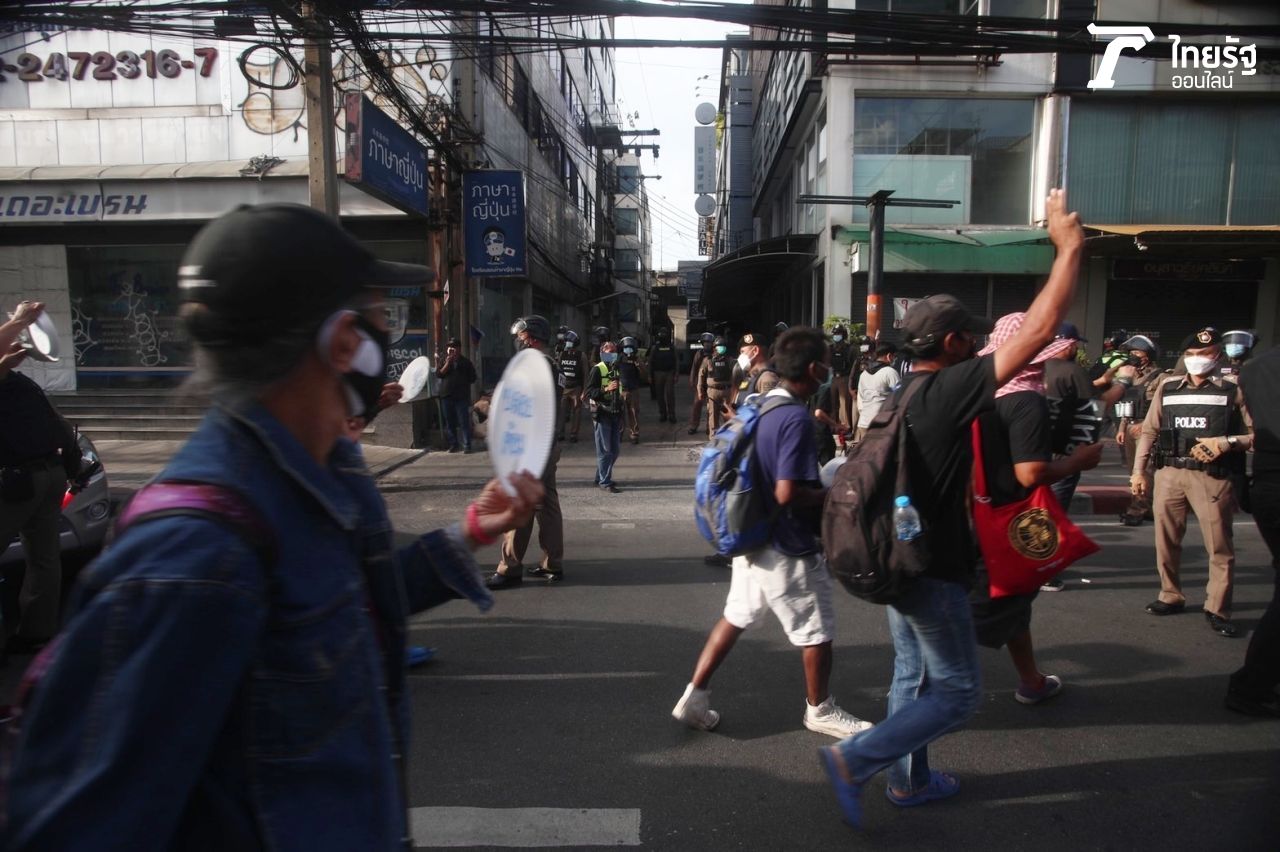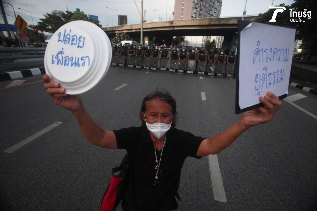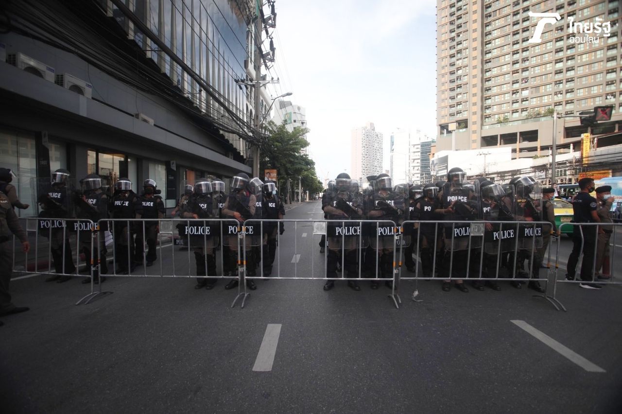 ขณะเดียวกันเจ้าหน้าที่ตำรวจได้นำกำลังมาปิดกั้นที่แยกสามเหลี่ยมดินแดงเป็นที่เรียบร้อยแล้ว โดยตรึงแถวเรียงหน้ากระดานก่อนถึงใต้ทางด่วนดินแดง เพื่อไม่ให้มวลชนผ่านไปได้ ทำให้การจราจรต้องถูกปิดไปบางส่วนโดยปริยาย โดยเจ้าหน้าที่ยังประกาศแจ้งข้อกฎหมาย และให้เลิกการชุมนุมตั้งแต่ตอนนี้ พร้อมขอให้สื่อมวลชนขึ้นทางเท้าและเปิดการจราจรในเวลา 17.25 น. ทำให้รถที่มาจากทางแฟลตดินแดงตรงมาได้ และเลี้ยวขวาไปยังถนนวิภาวดีรังสิต ขาออกได้ พร้อมขอกลุ่มมวลชนไม่ยุยง ปลุกปั่น ด่าทอ และขอให้ทำกิจกรรมบนทางเท้าเท่านั้น โดยจนถึงเวลา 17.30 น. เหตุการณ์ยังเป็นไปด้วยความสงบ อย่างไรก็ตามพบว่าผู้เข้าร่วมการชุมนุมเป็นผู้ใหญ่ที่มาเรียกร้องการปล่อยตัวผู้ที่ถูกจับกุมคุมขัง.