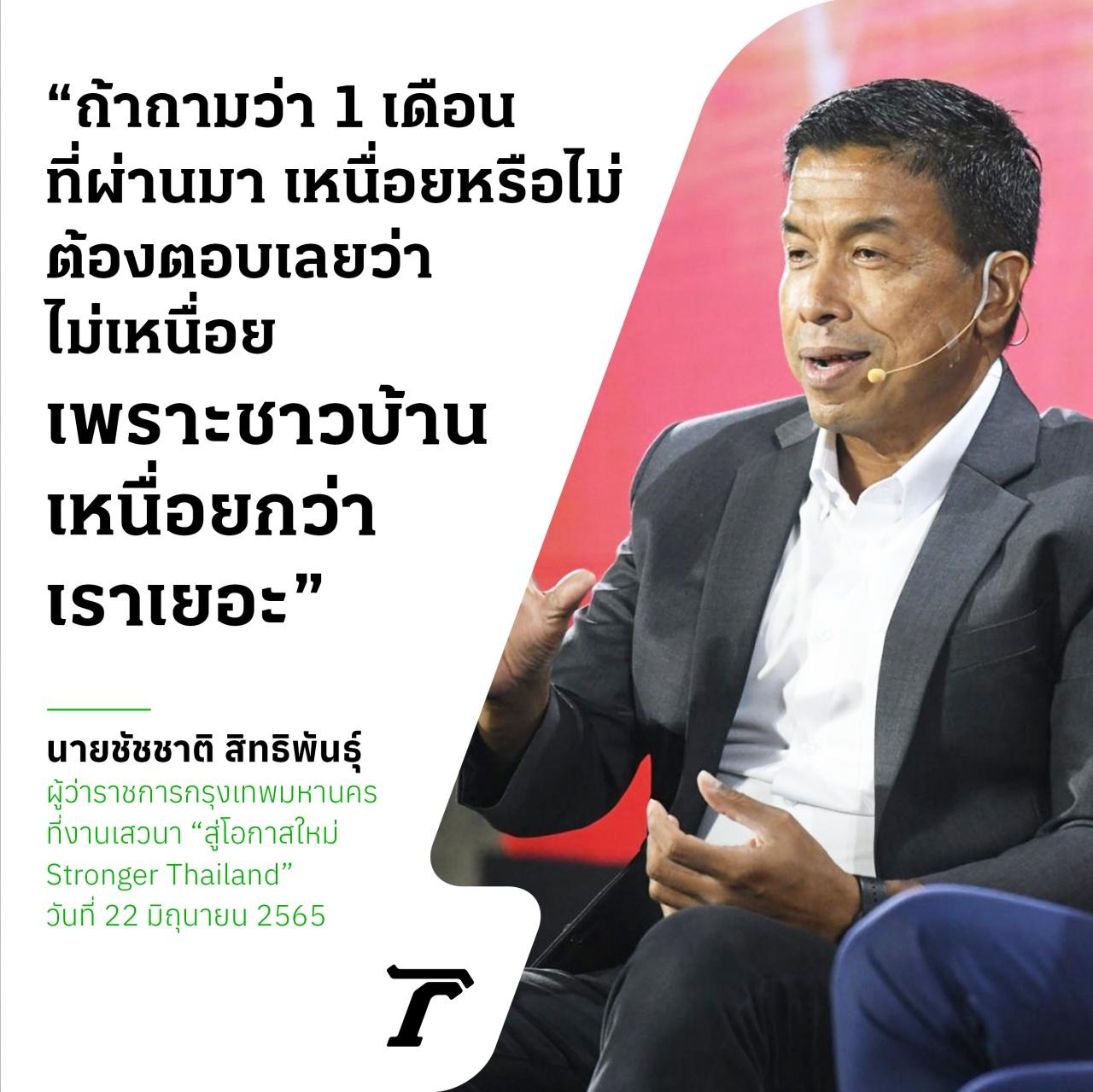 วันที่ 22 มิ.ย. 2565 ที่โรงแรมพูลแมน คิงพาวเวอร์ รางน้ำ เขตราชเทวี ผู้สื่อข่าวรายงานว่า นายชัชชาติ สิทธิพันธุ์ ผู้ว่าราชการกรุงเทพมหานคร เข้าร่วมงานเสวนา “สู่โอกาสใหม่ Stronger Thailand” โดยมีนายเศรษฐา ทวีสิน ประธานอำนวยการและกรรมการผู้จัดการใหญ่ บริษัท แสนสิริ จำกัด (มหาชน) ร่วมพูดคุยในหัวข้อ “Stronger Bangkok ; Stronger Thailand”