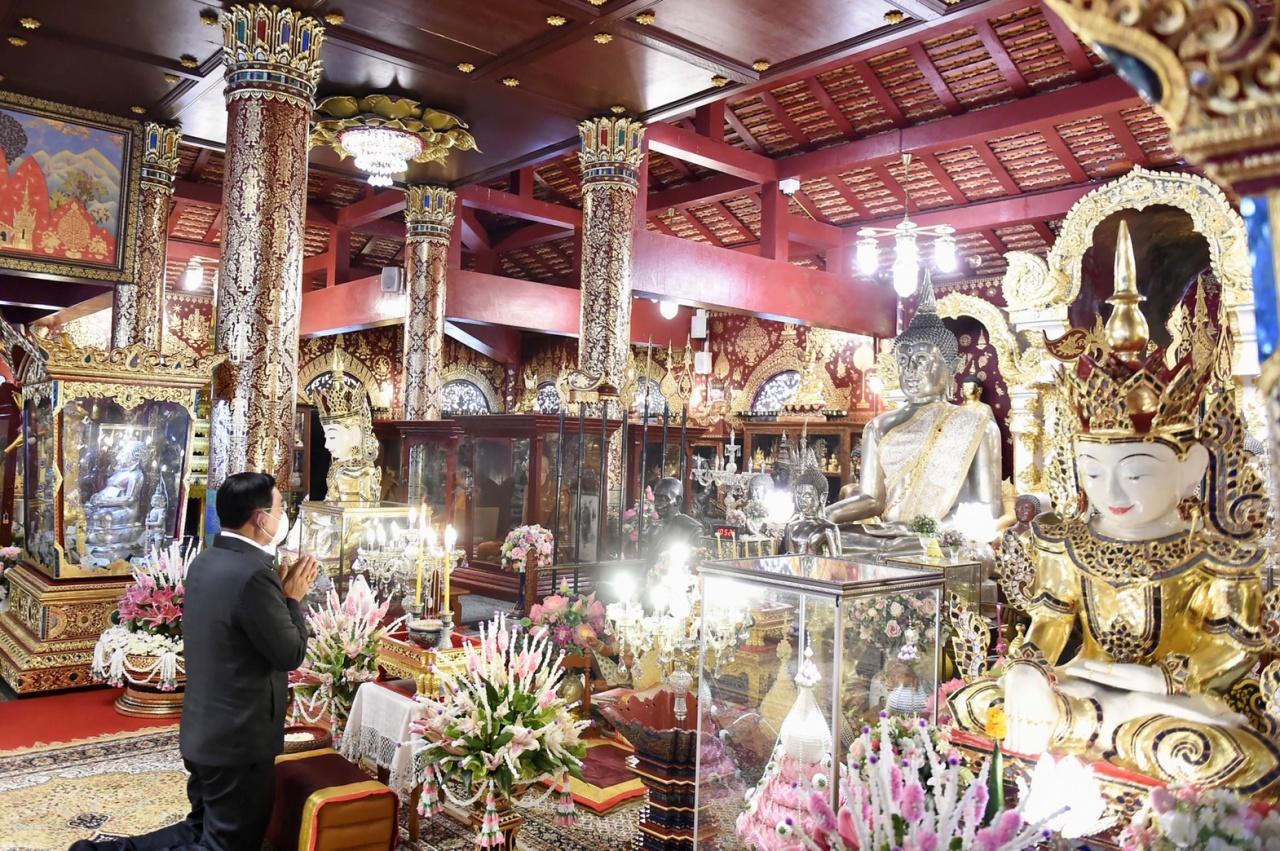 เมื่อเดินทางถึงวัดป่าดาราภิรมย์ นายกฯเข้าสู่ภายในมณฑปพระจุฬามณีศรีบรมธาตุ (หอแก้ว) จุดธูปเทียนบูชาพระประธาน ถวายสักการะและเครื่องกัปปิยภัณฑ์ แด่พระราชวิสุทธิญาณ เจ้าคณะจังหวัดเชียงใหม่-ลำพูน-แม่ฮ่องสอน (ธรรมยุต) เจ้าอาวาสวัดป่าดาราภิรมย์ พระราชวิสุทธิญาณ อนุโมทนาให้พรและสนทนาธรรมกับนายกฯและคณะ พร้อมกันนี้ นายกฯได้น้อมถวายกัปปิยภัณฑ์ แด่พระครูวิบูลธรรมกิจ (บัวเกตุ ปทุมสิโร) เจ้าอาวาสวัดป่าปางกึ๊ดกิตติธรรม ต.อินทขิล อ.แม่แตง ซึ่งได้พักฟื้นอาการอาพาธอยู่ภายในวัดป่าดาราภิรมย์ จากนั้น นายกฯไปนมัสการพระทันตธาตุ หรือพระเขี้ยวแก้ว และเยี่ยมชมปูชนียวัตถุสิ่งศักดิ์สิทธิ์ ซึ่งทางวัดได้จัดแสดงไว้ภายในหอแก้วชั้นบน ก่อนออกเดินทางต่อไปยังศูนย์ประชุมและแสดงสินค้านานาชาติฯ จังหวัดเชียงใหม่