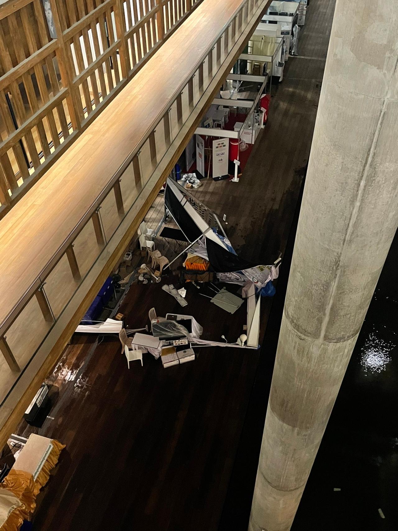 ลงวันที่ 1 ก.ค. 65) ส่งผลให้มีพายุฝนสาดเข้ามาในอาคาร บริเวณรอบโถงอาคารกลาง ชั้น 1 พื้นที่โดยรอบสระมรกต ซึ่งเป็นสถานที่จัดงาน "90 ปี รัฐสภา การเดินทางและความหวัง" ระหว่างวันที่ 27 มิ.ย. - 8 ก.ค. 65 โดยสำนักงานเลขาธิการสภาผู้แทนราษฎรได้จัดบูธนิทรรศการรอบพื้นที่ เป็นบูธชั่วคราวสร้างจากไม้อัดชนิดกันน้ำ พ่นสีอะคริลิกโดยวัสดุที่ใช้เป็นวัสดุที่สามารถถอดเก็บและใช้ได้อีก เพื่อความคุ้มค่าและสมประโยชน์สูงสุด โดยพื้นที่จัดนิทรรศการดังกล่าว เป็นพื้นที่เปิดโล่งตามแนวคิดในการออกแบบสถาปัตยกรรมอาคาร ทำให้มีบูธบางส่วนล้มลง และเกิดความเสียหาย สำหรับพื้นไม้ที่จัดนิทรรศการได้รับการออกแบบให้รองรับน้ำที่สาดเข้ามาโดยไม่ก่อให้เกิดความเสียหาย ทั้งนี้ สำนักงานเลขาธิการสภาผู้แทนราษฎรได้เร่งเข้ามาจัดการพื้นที่ และประกอบบูธที่ล้มและเสียหายให้กลับมาในสภาพเดิม เพื่อให้การจัดแสดงนิทรรศการต่อตามวัตถุประสงค์ของการจัดงาน