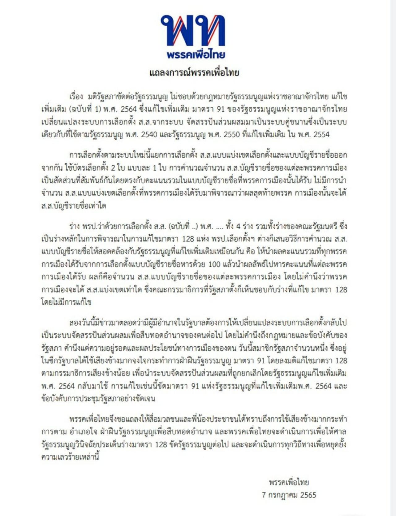 วันที่ 7 ก.ค. เมื่อเวลา 10.00 น. นพ.ชลน่าน ศรีแก้ว หัวหน้าพรรคเพื่อไทย นายประเสริฐ จันทรรวงทอง เลขาธิการ พรรค พร้อมด้วย กมธ. และ ส.ส.ของพรรคเพื่อไทย แถลงข่าว พรรคเพื่อไทยออกแถลงการณ์ ต่อมติของรัฐสภา กรณีการคำนวน ส.ส.แบบบัญชีรายชื่อ หารด้วย 500 ชี้ชัด สภา ผ่านสูตรหาปาร์ตี้ลิสต์ หาร 500 ขัด รธน.มาตรา 91 อ้าง สภาใช้เสียงข้างมาก ตามอำเภอใจ ฝ่าฝืนรัฐธรรมนูญ เพื่อสืบทอดอำนาจ ยัน จะดำเนินการทุกวิถีทางหยุดยั้งความเลวร้ายนี้