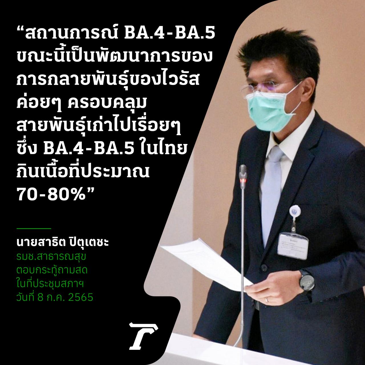 “ผมย้ำว่าในสายพันธุ์ BA.4 และ BA.5 เราทราบตรงกันทั่วโลกว่าสถานการณ์ BA.4-BA.5 ซึ่งขณะนี้ในประเทศไทยเป็นพัฒนาการของการกลายพันธุ์ของไวรัสว่า พอมันมีสายพันธุ์ใหม่ขึ้นมามันจะค่อยๆ ครอบคลุมสายพันธุ์เก่าไปเรื่อยๆ ซึ่ง BA.4-BA.5 ในประเทศไทยก็กินเนื้อที่ไประมาณสัก 70-80% BA.4-BA.5 มีอัตราการติดเชื้อทั่วโลกเพิ่มขึ้น 30% ประเทศไทยก็เพิ่มขึ้น”