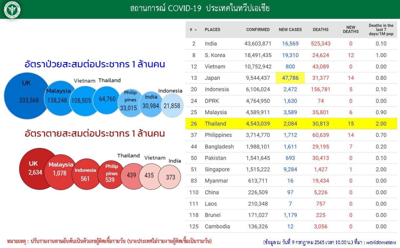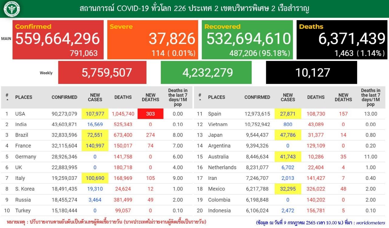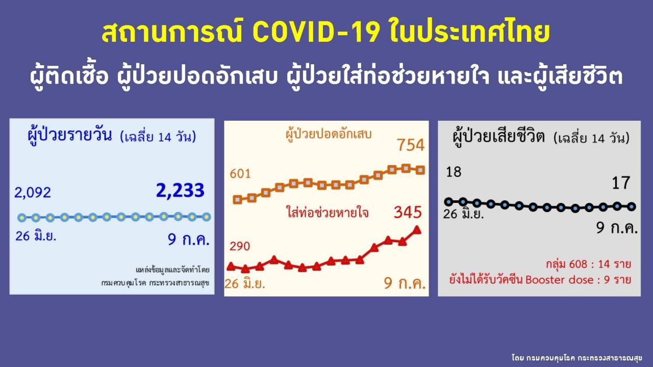 วันที่ 9 ก.ค. 2565 ศูนย์บริหารสถานการณ์โควิด-19 หรือ ศบค. รายงานสถานการณ์ผู้ติดเชื้อโควิด-19 ในประเทศไทย มีรายละเอียดดังนี้