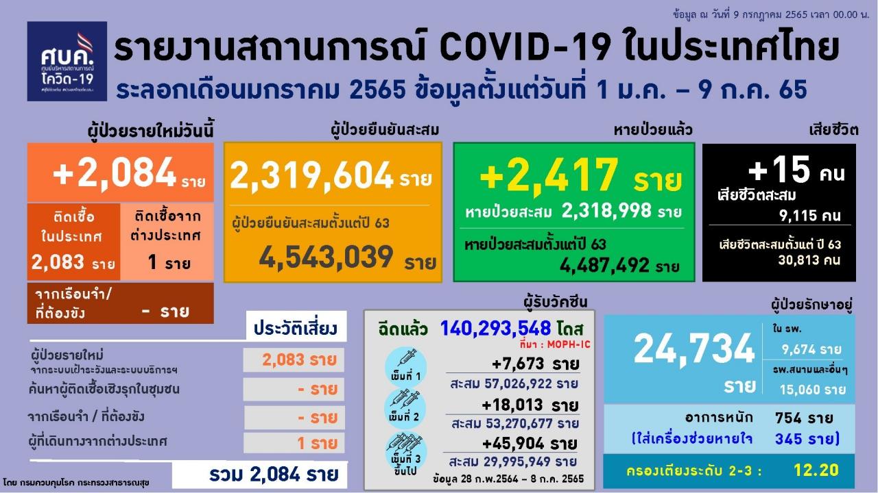 ศบค. รายงานสถานการณ์โควิดวันนี้ 9 ก.ค. 2565 ติดเชื้อ 2,084 ราย ยอดผู้เสียชีวิต 15 ศพ อาการหนัก 754 ราย ใส่เครื่องช่วยหายใจ 345 ราย อัตราครองเตียงเพิ่มขึ้นเป็น 12.2%