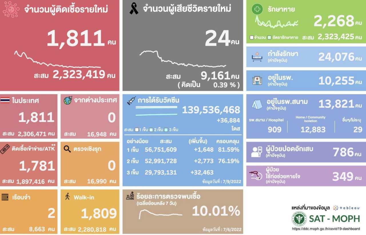 ศบค.รายงานสถานการณ์โควิดวันนี้ 11 ก.ค. 2565 ติดเชื้อ 1,811 ราย ยอดผู้เสียชีวิต 24 ศพ อาการหนัก 786 ราย ใส่เครื่องช่วยหายใจ 349 ราย อัตราครองเตียง 12.10%
