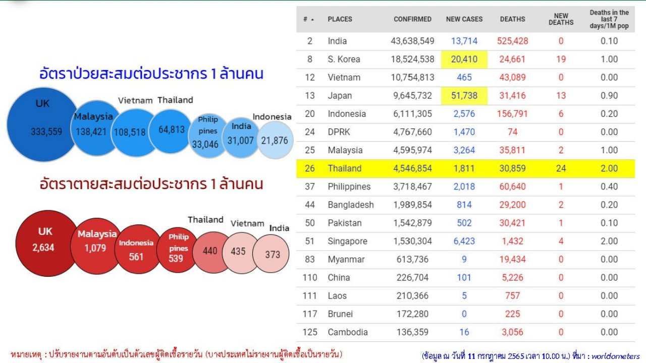 วันที่ 11 ก.ค. 2565 ศูนย์บริหารสถานการณ์โควิด-19 หรือ ศบค. รายงานสถานการณ์ผู้ติดเชื้อโควิด-19 ในประเทศไทย มีรายละเอียดดังนี้