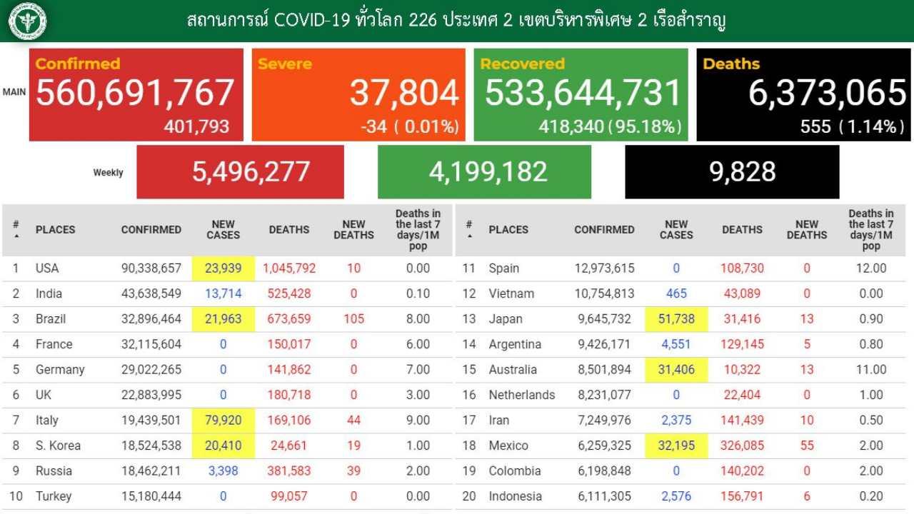 ขณะที่สถานการณ์ทั่วโลกนั้น วันนี้มีรายงานผู้ติดเชื้อ 401,793 รายต่อวัน และมีผู้เสียชีวิตรวม 555 ศพ โดยติดเชื้อมากที่สุดวันนี้เป็นประเทศอีตาลี จำนวน 79,920 ราย