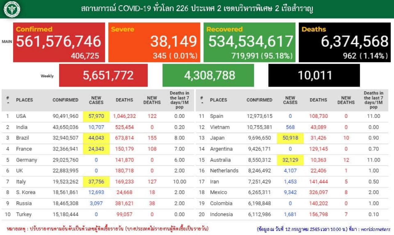 วันที่ 12 ก.ค. 2565 ศูนย์บริหารสถานการณ์โควิด-19 หรือ ศบค. รายงานสถานการณ์ผู้ติดเชื้อโควิด-19 ในประเทศไทย มีรายละเอียดดังนี้