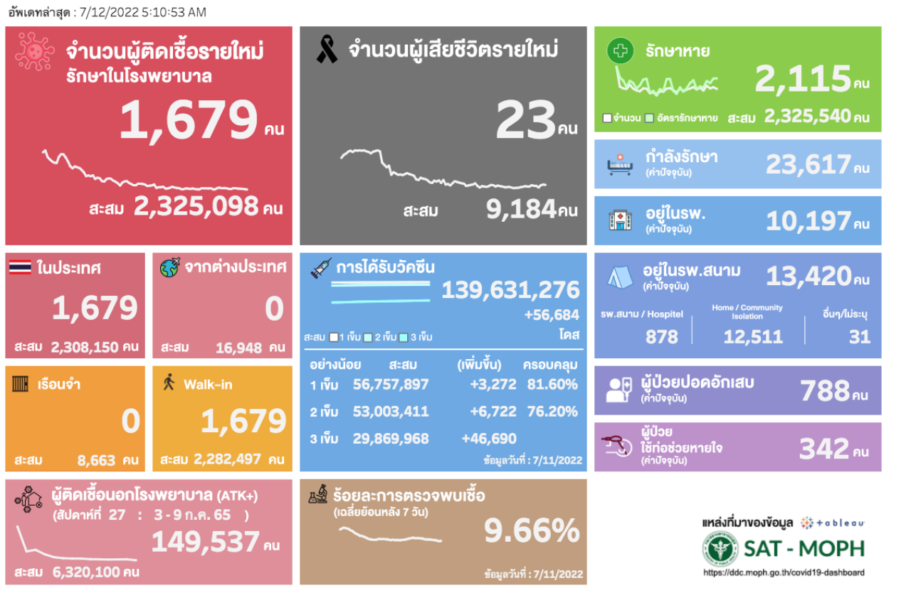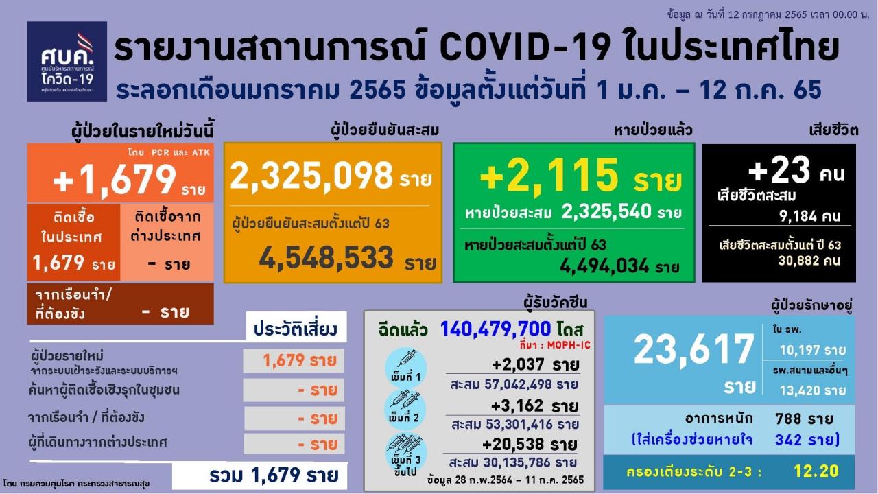 ศบค. รายงานสถานการณ์โควิดวันนี้ 12 ก.ค. 2565 ติดเชื้อ 1,679 ราย ยอดผู้เสียชีวิต 23 ศพ อาการหนัก 788 ราย ใส่เครื่องช่วยหายใจ 342 ราย ยอด ATK สัปดาห์ที่ 27 (3-9 ก.ค.) สูงถึง 149,537 ราย