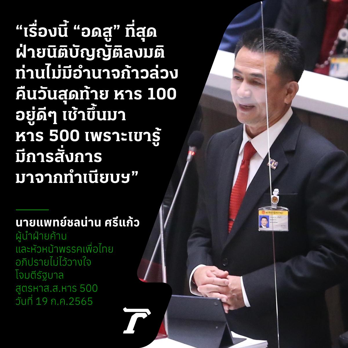 ผู้นำฝ่ายค้านยังกล่าวต่อว่า เรื่องนี้ "อดสู" ที่สุด เราแบ่งแยกอำนาจไม่ก้าวล่วงซึ่งกันและกัน ฝ่ายนิติบัญญัติลงมติท่านไม่มีอำนาจก้าวล่วงมาฝ่ายนิติบัญญัติ เป็นไปได้อย่างเรื่อง เราแก้ รธน.จากระบบจัดสรรปันส่วนผสม คืนวันสุดท้าย หาร 100 อยู่ พอเช้าขึ้นมา หาร 500 เลย เพราะเขารู้ว่ามีการสั่งการมาจากทำเนียบรัฐบาล