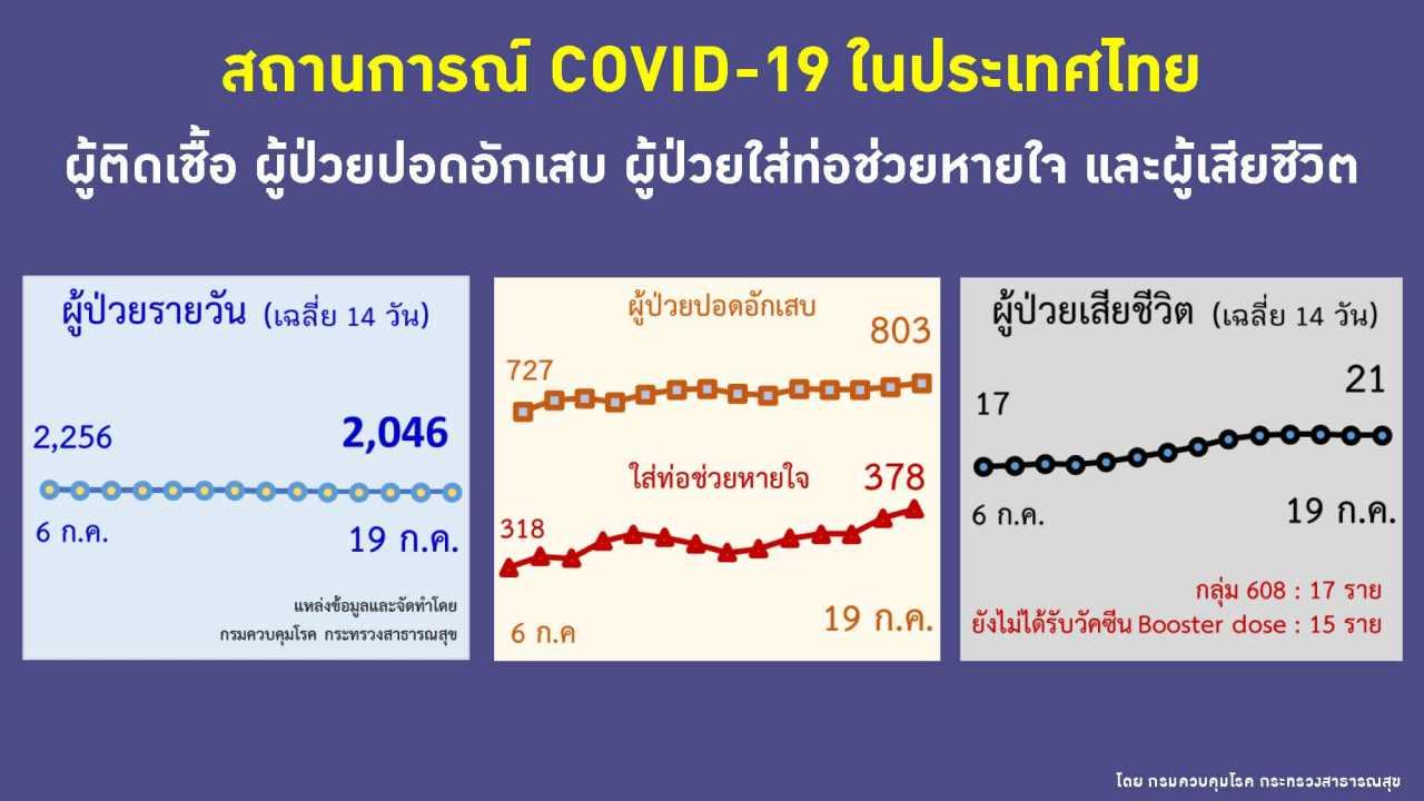 วันที่ 19 ก.ค. 2565 ศูนย์บริหารสถานการณ์โควิด-19 หรือ ศบค. รายงานสถานการณ์ผู้ติดเชื้อโควิด-19 ในประเทศไทย มีรายละเอียดดังนี้