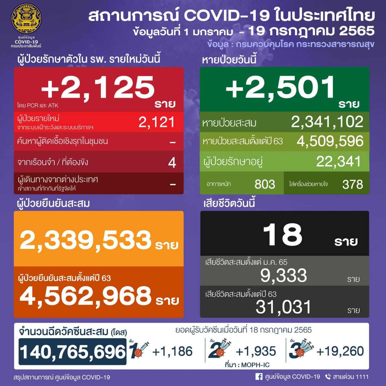 ศบค. รายงานสถานการณ์โควิดวันนี้ 19 ก.ค. 2565 ติดเชื้อ 2,125 ราย ยอดผู้เสียชีวิต 18 ศพ อยู่ระหว่างรักษาตัว 22,341 ราย อาการหนัก 803 ราย อัตราครองเตียงระดับ 2-3 อยู่ที่ 14.40%