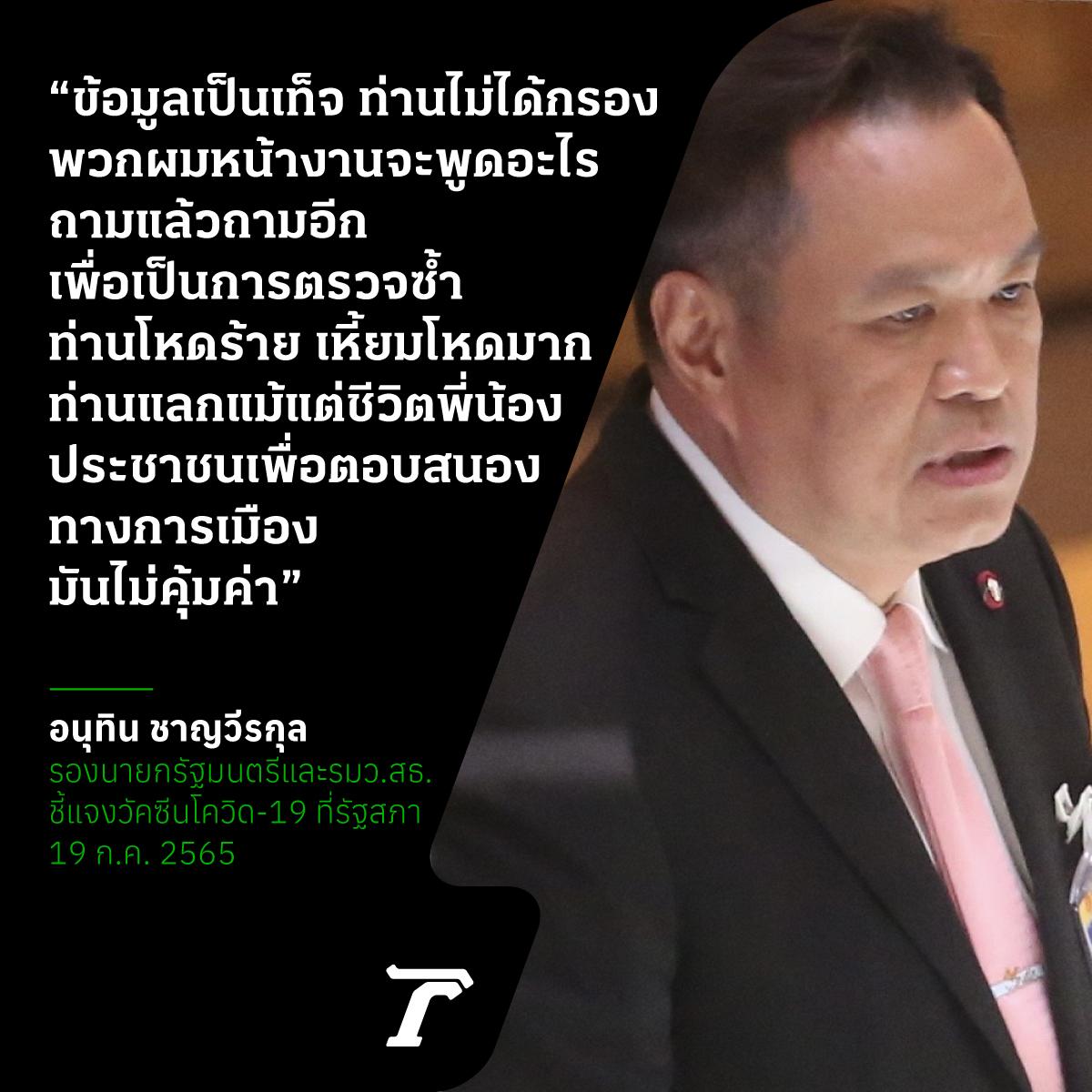 "ข้อมูลนำเสนอเป็นเท็จครับ ท่านไม่ได้กรอง พวกผมหน้างานจะมาพูดอะไร ถามแล้วถามอีก เพื่อเป็นการตรวจซ้ำ การแผยแพร่ข้อมูลออกไปสู่ประชาชน ท่านโหดร้ายนะครับ ท่านเหี้ยมโหดมากเลย ท่านแลกหมดละ ท่านแลกแม้แต่ชีวิตของพี่น้องประชาชนเพื่อตอบสนองทางการเมืองมันไม่คุ้มค่า ขอพวกท่านเว้นเรื่องสาธารณสุขสักเรื่องเถอะครับ ประชาชนยากลำบากกันมากแล้ว ขอให้เป็นเรื่องของพวกเรา อย่าไปเอาคนอื่นมาเกี่ยวข้อง ผมยินดีเปลี่ยนความขัดแย้งให้พี่น้องประชาชนของเราไม่วิตกกังวล เพราะท่านเหล่านั้นคือประชาชนของพวกเรา ที่เขาให้มาทำงานในรัฐบาลชุดนี้" นายอนุทิน กล่าว...