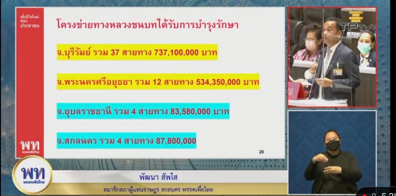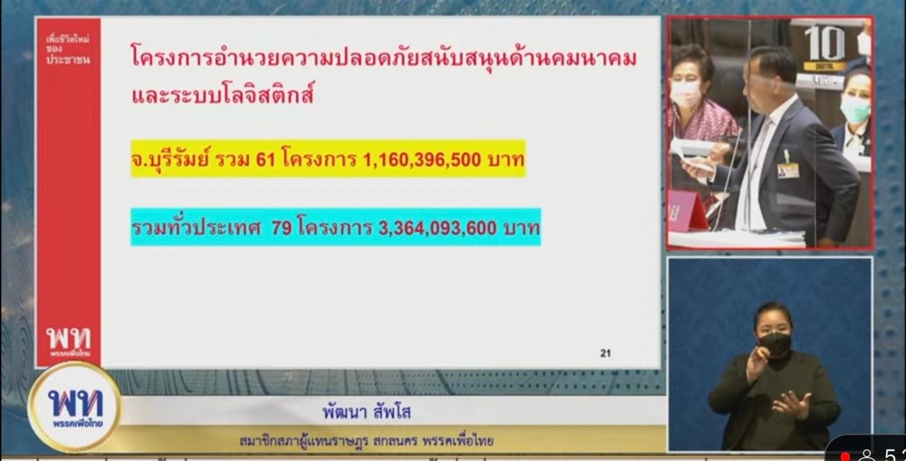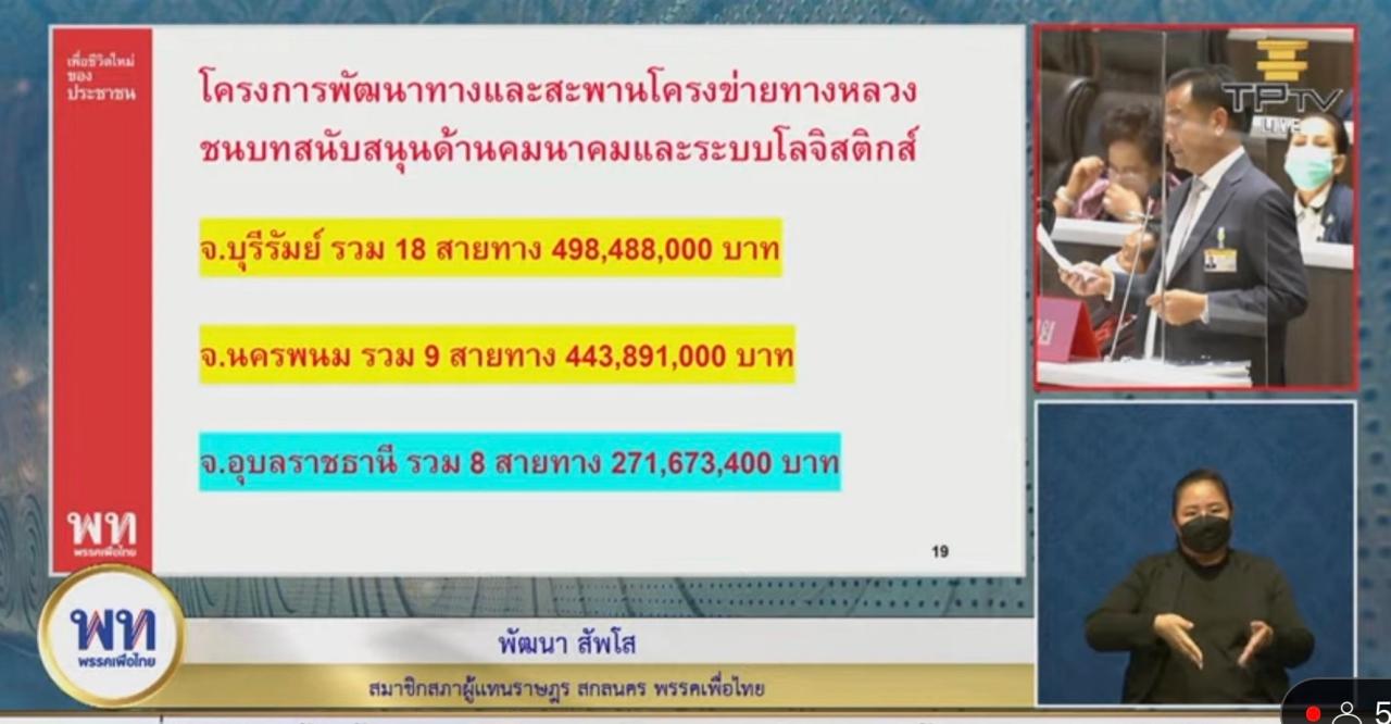 เมื่อเวลา 17.15 น. วันที่ 19 ก.ค. 2565 ที่อาคารรัฐสภา ในการประชุมสภาผู้แทนราษฎร ญัตติขอเปิดอภิปรายทั่วไปเพื่อลงมติไม่ไว้วางใจรัฐมนตรีเป็นรายบุคคล นายพัฒนา สัพโส ส.ส.สกลนคร พรรคเพื่อไทย กล่าวอภิปรายไม่ไว้วางใจ นายศักดิ์สยาม ชิดชอบ รัฐมนตรีว่าการกระทรวงคมนาคม ถึงการจัดสรรงบกรมทางหลวง ที่พบว่าเทงบประมาณไปที่จ.บุรีรัมย์ มากถึง 2,421 ล้านบาท ทั้งที่เสียภาษีไม่ต่างจากจังหวัดอื่นและบางจังหวัดเสียภาษีมากกว่า โดยได้ชี้แจงถึงโครงการพัฒนาทางและสะพานโครงข่ายทางหลวงชนบทสนับสนุนด้านคมนาคมและระบบโลจิสติกส์ ที่ จ.บุรีรัมย์ ได้ไปทั้งหมด 18 สายทาง 498,488,000 บาท โครงข่ายทางหลวงชนบทได้รับการบำรุงรักษา ได้รวม 37 สายทาง 737,100,000 บาท และที่ไฮไลต์คือ โครงการอำนวยความปลอดภัยสนับสนุนด้านคมนาคมและระบบโลจิสติกส์ ที่ได้ไปรวม 61 โครงการ 1,160,396,500 บาท เมื่อเทียบกับทั่วประเทศ 79 โครงการ อยู่ที่ 3,364,093,600 บาท จึงขอให้ปีหน้าเปลี่ยนชื่อเป็นโครงการอำนวยความปลอดภัยจ.บุรีรัมย์สนับสนุนด้านคมนาคมและระบบโลจิสติกส์ แทนดีกว่า พร้อมทั้งคำถามเหตุใดงบประมาณจึงไปเทอยู่ที่จังหวัดบุรีรัมย์