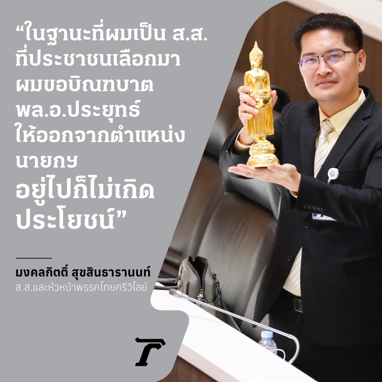 ขณะที่ในช่วงท้าย นายมงคลกิตติ์ชูพระพุทธรูปปางอุ้มบาตร แล้วพูดว่า “ขอพูดแทนคนไทยทั้งประเทศ กว่า 60 ล้านคน ขอบิณฑบาต พล.อ.ประยุทธ์ จันทร์โอชา ให้ปลดปล่อยประเทศไทย ประชาชนคนไทย ให้ท่านลาออกจากตำแหน่งนายกรัฐมนตรี ท่านปลดปล่อยไปเสียทีครับ เพราะว่า 8 ปีแล้ว ท่านอยู่ไปก็ไม่เกิดประโยชน์ ผมขอบิณฑบาตครับ”
