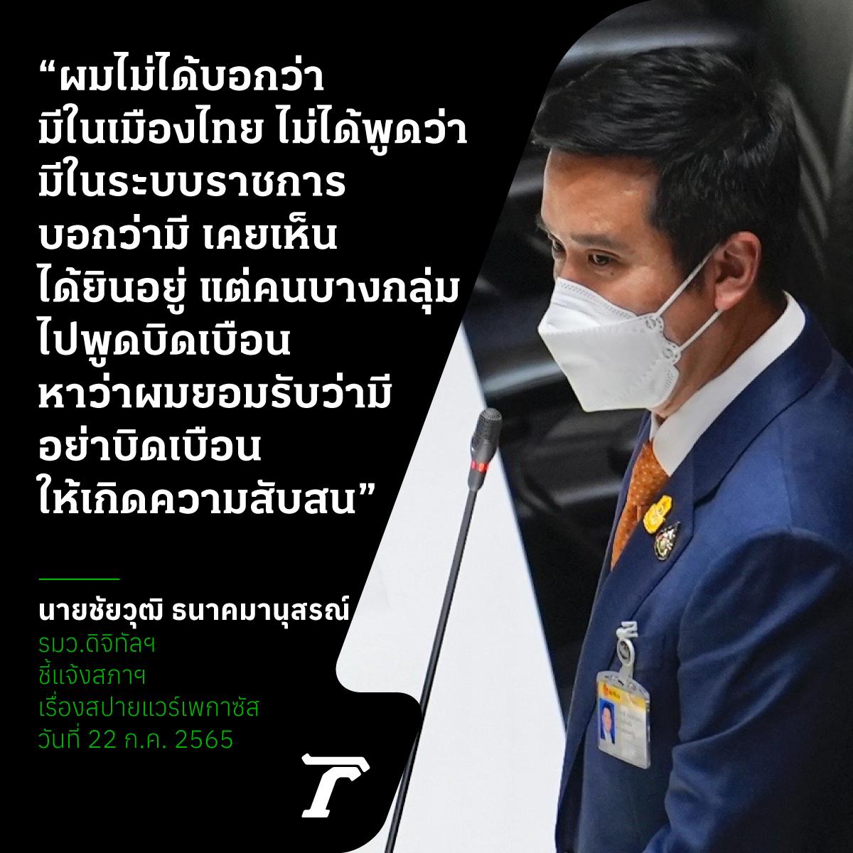 วันที่ 22 ก.ค. 2565 จากกรณี พล.อ.ประยุทธ์ จันทร์โอชา นายกรัฐมนตรีและรัฐมนตรีว่าการกระทรวงกลาโหม ชี้แจงในการประชุมสภาผู้แทนราษฎร ญัตติขอเปิดอภิปรายทั่วไปเพื่อลงมติไม่ไว้วางใจรัฐมนตรีเป็นรายบุคคล ว่า ไม่รู้จักสปายแวร์เพกาซัส (Pegasus) เพราะถูกหาว่าไม่ฉลาดอยู่แล้ว ไม่มีความจำเป็นที่ต้องเสียเงินงบประมาณตามเรื่องแบบนี้ เปิดในโซเชียลก็เห็นแล้วว่าใครเป็นคนทำ ยืนยันว่าตนเองไม่ได้ทำ และไม่ให้ค่าคนเหล่านี้ที่อยู่เบื้องหลัง มีกระบวนการ แต่เห็นใจคนที่แชร์ต่อเพราะไม่เข้าใจ และให้เป็นเรื่องของกฎหมาย