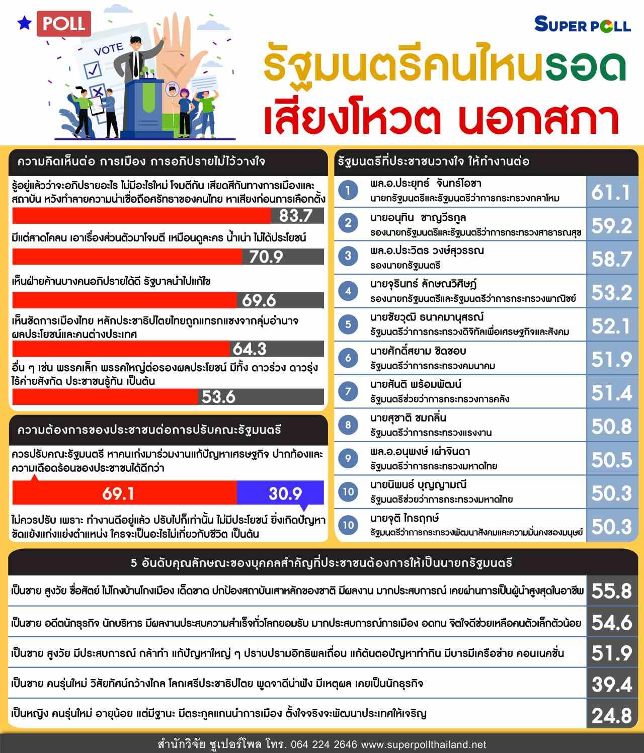 ผอ.ซูเปอร์โพล กล่าวว่า ผลโพลชิ้นนี้ชี้ให้เห็นว่า รัฐมนตรีที่รอดจากเสียงโหวตนอกสภาไว้วางใจให้ทำงานต่อมากที่สุดและเรียงลำดับคือ พล.อ.ประยุทธ์ จันทร์โอชา นายอนุทิน ชาญวีรกูล พล.อ.ประวิตร วงษ์สุวรรณ เป็นกลุ่มรัฐมนตรีในสามอันดับแรกที่ประชาชนวางใจและที่แตกต่างจากผลโหวตในสภาคือ นายจุรินทร์ ลักษณวิศิษฏ์ ที่ขึ้นมาเป็นอันดับสี่ และที่น่าพิจารณาคือ สี่รัฐมนตรีในผลสำรวจครั้งนี้ที่รอดครึ่งหนึ่งเฉียดฉิว