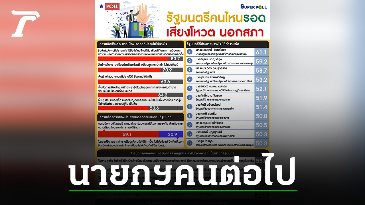 โพล ชี้ ประชาชน หนุน 5 คุณสมบัติ นายกรัฐมนตรี คนต่อไป เป็นชายสูงวัย เน้นไม่โกง คุมความขัดแย้งคนในชาติได้ ปกป้องสถาบัน เป็นนักธุรกิจ