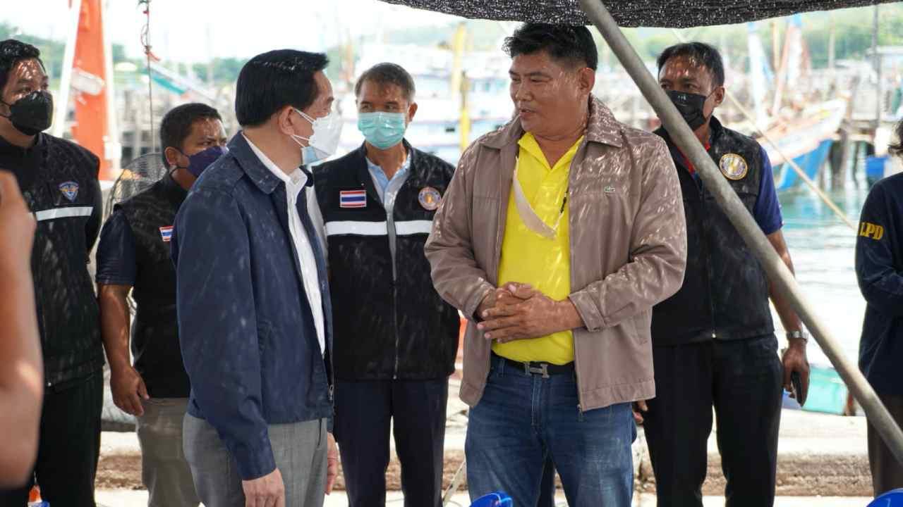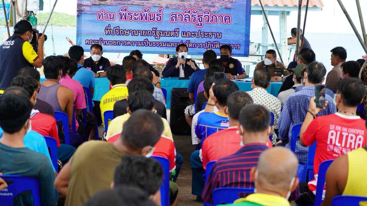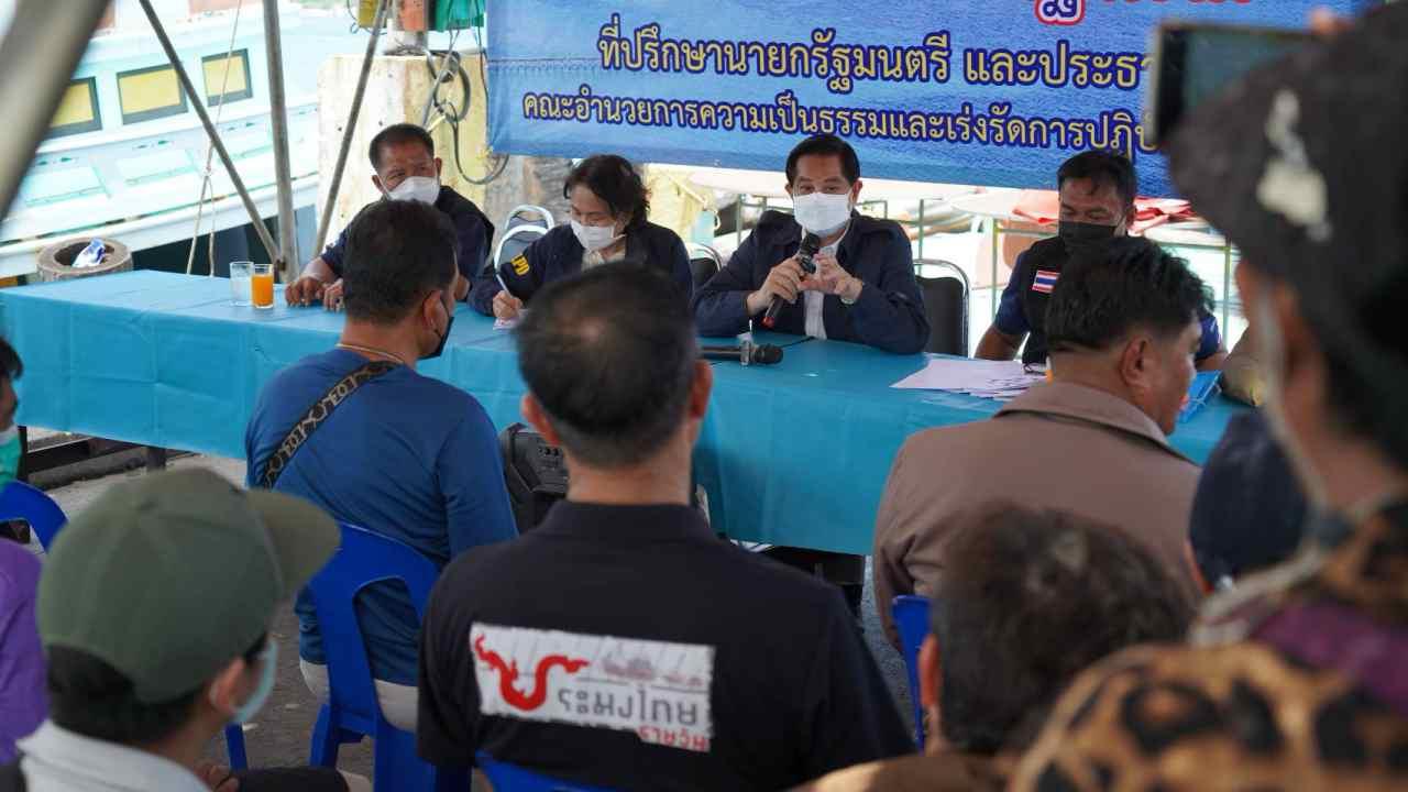 โดยช่วงเช้าได้เดินทางไปยังท่าเรือแสมสาร อ.สัตหีบ จ.ชลบุรี มีกลุ่มผู้ประกอบการเรือประมง นำโดยนายธนกร ถาวรชินโชติ นายกสมาคมประมงแสมสาร และนายณัฐพงศ์ วรรณพัฒน์ ประมงจังหวัดชลบุรี รายงานข้อมูลรายละเอียด ระบุว่าเมื่อวันที่ 16 มี.ค.2565 หน่วยป้องกันและปราบปรามประมงทะเลอ่างศิลา (ชลบุรี) ได้นำกำลังเจ้าหน้าที่ตรวจปราบปราม และควบคุมการทำประมงผิดกฎหมาย บริเวณอ่าวแสมสาร พบว่ามีการใช้เอกสารปลอมของแรงงานประมงต่างด้าว ซึ่งเป็นการกระทำผิดพระราชกำหนดการประมง พ.ศ.2558 และที่แก้ไขเพิ่มเติมตามมาตรา 83 ฐานความผิด เป็นเจ้าของเรือใช้แรงงานต่างด้าวทำงานบนเรือโดยไม่มีหนังสือคนประจำเรือ ทำให้ผู้ประกอบการต้องเสียค่าปรับไม่ต่ำกว่า 1,600,000 บาท และยังมีความผิดฐานปลอมแปลงเอกสารและใช้เอกสารปลอมด้วย ซึ่งได้มีการดำเนินคดี โดยจะไม่สามารถทำการประมงในรอบถัดไปเป็นเวลา 5 ปี แต่ต่อมาได้มีการยื่นเรื่องขอความเป็นธรรม และตรวจสอบจนพบว่า กลุ่มผู้ประกอบการประมงเป็นเหยื่อที่ถูกกระทำจริง ทำให้สามารถนำเอกสารหลักฐานที่ถูกต้องมายื่นคำขอเพื่อทำหนังสือคนประจำเรือใหม่ได้อีกครั้ง และออกเรือได้ปกติแล้วจำนวนหนึ่ง แต่ยังคงมีเรืออีก 9 ลำที่ยังถูกกรมประมงออกคำสั่งห้ามออกเรือ ทั้งที่พนักงานสอบสวนสั่งไม่ฟ้องเจ้าของเรือทั้ง 9 ลำ ทำให้ปัจจุบันได้รับความเดือดร้อนอย่างหนัก ซึ่งเรื่องนี้ผู้ร้องเรียนทั้งหมดต้องการขอเป็นธรรมให้ช่วยพิจารณาหาทางช่วยเหลือ