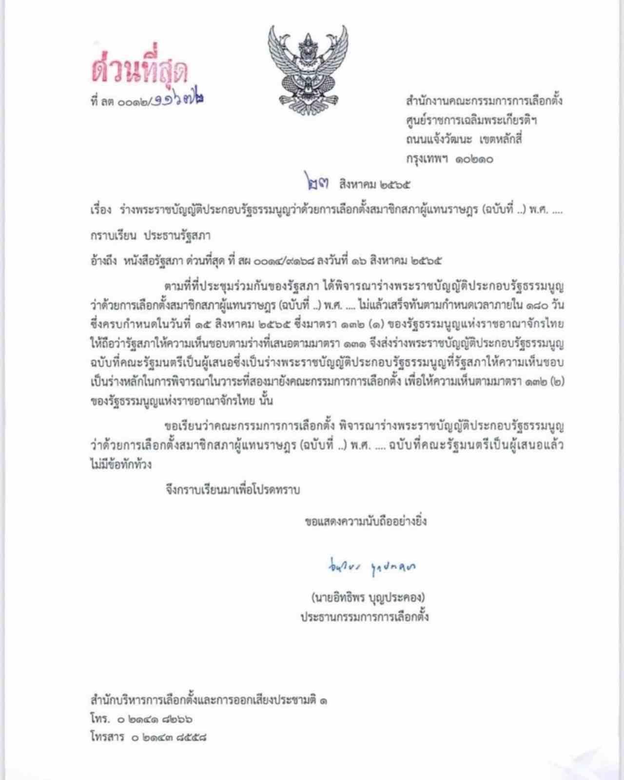 เมื่อเวลา 15.00 น. วันที่ 23 สิงหาคม ที่รัฐสภา นพ.สุกิจ อัถโถปกรณ์ ที่ปรึกษาประธานสภาผู้แทนราษฎร แถลงว่า ในวันนี้ (23 สิงหาคม) ประธานคณะกรรมการการเลือกตั้ง (กกต.) ได้ส่งหนังสือเรื่องร่างพระราชบัญญัติประกอบรัฐธรรมนูญ (พ.ร.ป.) ว่าด้วยการเลือกตั้งสมาชิกสภาผู้แทนราษฎร ส.ส. (ฉบับที่…) พ.ศ. … มายังประธานรัฐสภาแล้ว โดย กกต.พิจารณาแล้วไม่มีข้อทักท้วงร่างกฎหมายดังกล่าว ดังนั้น ขั้นตอนต่อไปประธานรัฐสภาจะชะลอร่าง พ.ร.ป.ดังกล่าวไว้ 3 วัน เพื่อให้ ส.ส. ส.ว. หรือสมาชิกรัฐสภา รวมกันไม่น้อยกว่า 1 ใน 10 ของสมาชิกเท่าที่มีอยู่ของทั้งสองสภา ยื่นคำร้องขอให้ศาลรัฐธรรมนูญวินิจฉัยว่า ร่าง พ.ร.ป.ที่ กกต.ยืนยันมานั้นถูกต้องตามรัฐธรรมนูญหรือไม่ โดยจะครบกำหนด 3 วันในวันที่ 26 สิงหาคม หากมีผู้ร้องก็จะส่งเรื่องให้ศาลรัฐธรรมนูญพิจารณา และชะลอร่างดังกล่าวจนกว่าจะมีคำวินิจฉัย