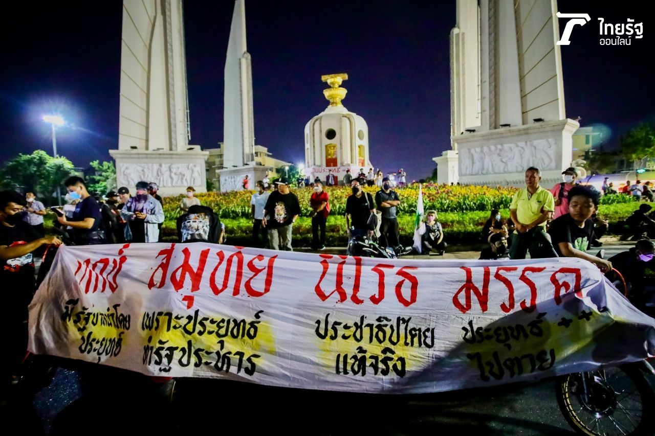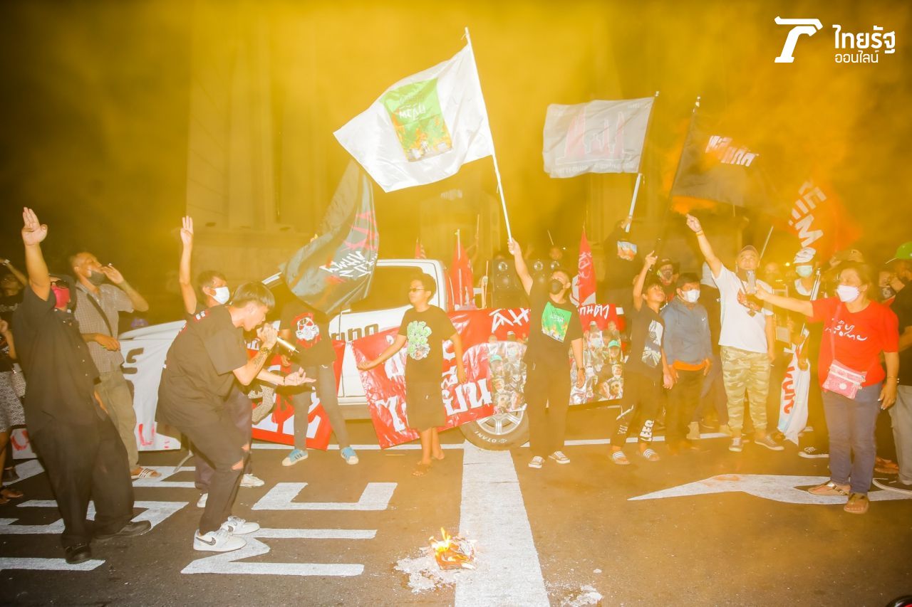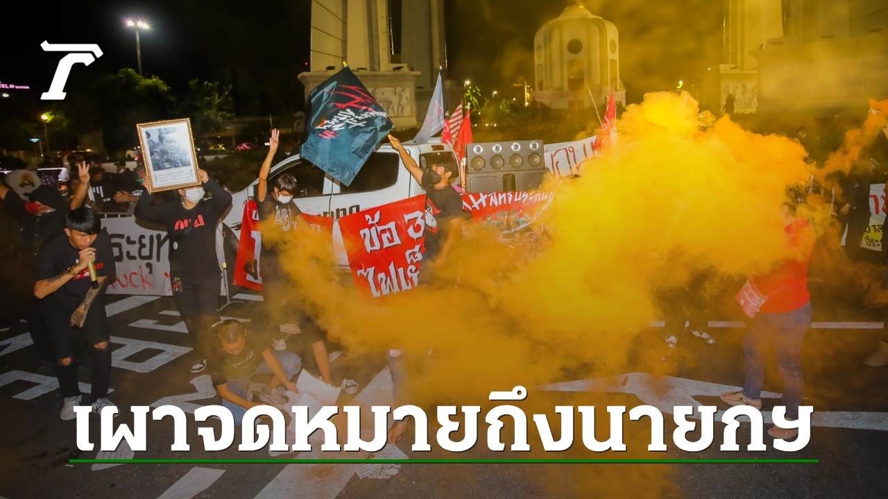 ม็อบอนุสาวรีย์ประชาธิปไตย เผาจดหมายที่เขียนถึง พล.อ.ประยุทธ์ จุดพลุควันสีส้ม สลับการชูสามนิ้ว เตือนเผด็จการยุติการสืบทอดอำนาจ ส่วนที่นางเลิ้ง ยังปักหลักทำกิจกรรม