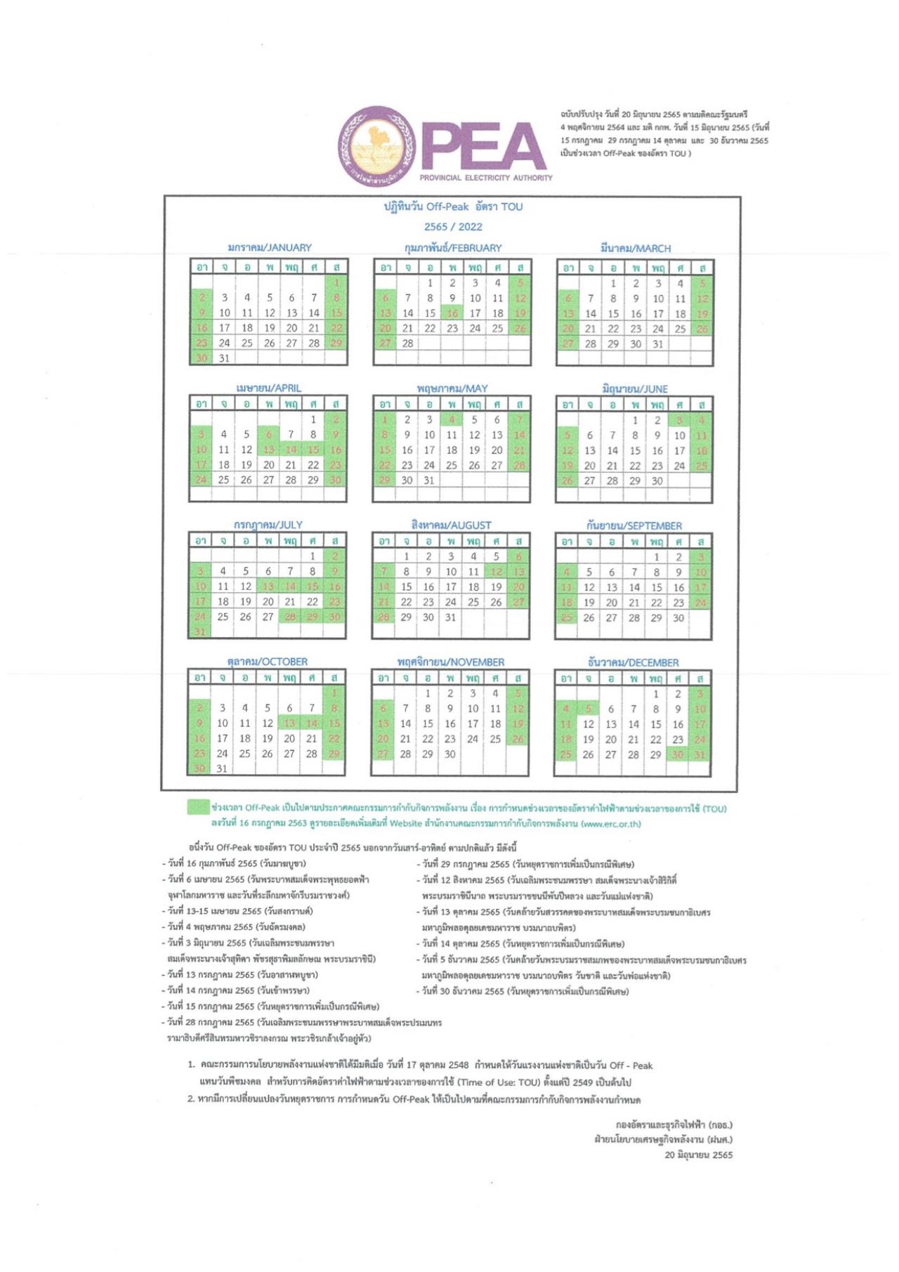 เพื่อให้เป็นไปตามมติและประกาศ กกพ. ข้างต้น การไฟฟ้าส่วนภูมิภาค ขอแจ้งให้ทราบว่า การกำหนดช่วงเวลาสำหรับอัตรา TOU วันที่ 15 กรกฎาคม 2565, วันที่ 29 กรกฎาคม 2565, วันที่ 14 ตุลาคม 2565 และวันที่ 30 ธันวาคม 2565 เป็นช่วงเวลา Off-Peak โดยเป็นไปตามปฏิทิน TOU ที่แนบอยู่ท้ายประกาศฉบับนี้