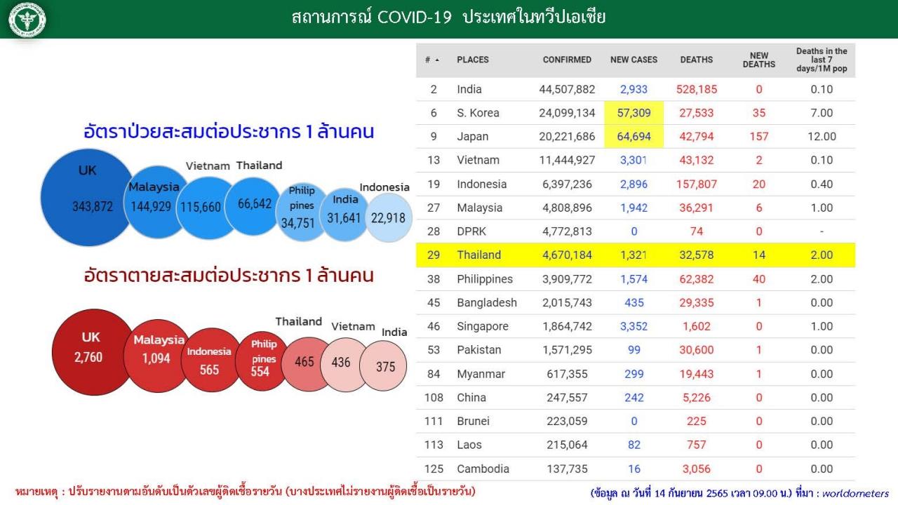 วันที่ 14 ก.ย. 2565 ศูนย์บริหารสถานการณ์การแพร่ระบาดของโรคติดเชื้อไวรัสโคโรนา 2019 (โควิด-19) หรือ ศบค. และกระทรวงสาธารณสุข รายงานสถานการณ์โควิด-19 ในประเทศไทย มีรายละเอียดดังนี้