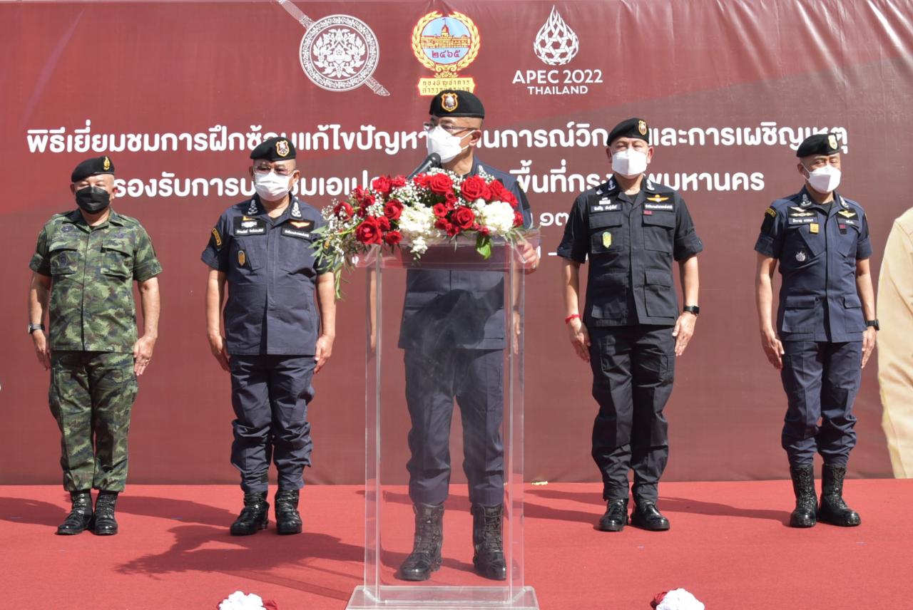เมื่อเวลา 13.30 น.วันที่ 19 ก.ย.65 ที่ศูนย์การค้าเดอะคริสตัล เอกมัย-รามอินทรา กรุงเทพฯ พล.ต.อ.สุวัฒน์ แจ้งยอดสุข ผู้บัญชาการตำรวจแห่งชาติ (ผบ.ตร.) พล.ต.อ.ดำรงศักดิ์ กิตติประภัสร์ รอง ผบ.ตร. พล.ต.ท.กิตติ์รัฐ พันธุ์เพ็ชร ผู้ช่วย ผบ.ตร. พล.ต.ท.สำราญ นวลมา ผู้บัญชาการตำรวจนครบาล (ผบช.น.) ชมการฝึกซ้อมแผนแก้ไขปัญหาสถานการณ์วิกฤติและการเผชิญเหตุ รองรับการประชุมเอเปก 2565 ที่จะมีขึ้นระหว่างวันที่ 18-19 พฤศจิกายน 2565 โดยมีคณะผู้แทนสำนักงานรักษาความมั่นคงทางการทูต สถานเอกอัครราชทูตสหรัฐอเมริกา ประจำประเทศไทย, สำนักงานรักษาความมั่นคง ทางการทูต สถานเอกอัครราชทูตฝรั่งเศส ประจำประเทศไทย, สำนักงานคณะกรรมการป้องกันและปราบปรามยาเสพติด ศูนย์ปฏิบัติการต่อต้านการก่อการร้ายสากล(ศตก.) กองทัพไทย ร่วมชมความฝึก ดูความพร้อมของสำนักงานตำรวจแห่งชาติ