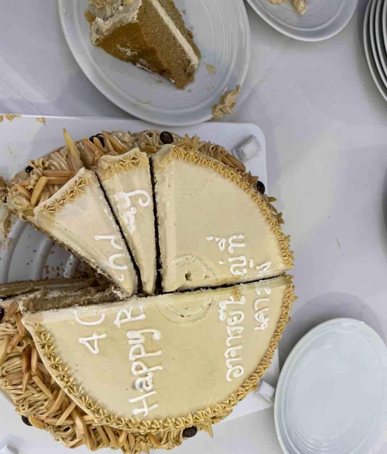 จากนั้นได้ร่วมกันร้องเพลง Happy birthday to you ทั้งนี้เค้กที่ได้นำมาเป่าเทียนได้เขียนหน้าเค้กว่า “Happy birthday อาจารย์ใหญ่ที่เคารพ” และนายเนวินก็ได้ใช้มีดตัดเค้กเพื่อแบ่งให้ผู้ร่วมงานรับประทาน