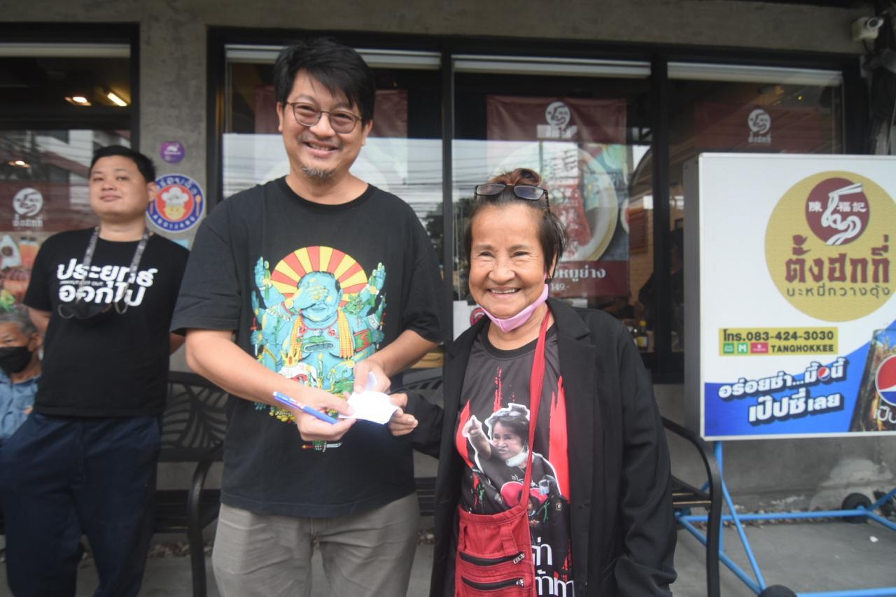 เนื่องจาก นายสมบัติได้แจกคูปองรับประทานอาหารฟรี 1 ชาม ให้กับผู้เข้าร่วมกิจกรรมทุกคนที่สามารถท่องข้อความ “ประยุทธ์อีไม่ใช่ผู้ดี อีขี่รถถังฝังหัววัยเด็ก ประยุทธ์อีชอบพูดเท็จ บะหมี่กวางตุ้งอย่ากินเผ็ดพริกป่นครึ่งช้อนพอ” ในจำนวนนี้ มี นางอมรัตน์ โชคปมิตต์กุล ส.ส.บัญชีรายชื่อและกรรมการบริหารพรรคก้าวไกล และ นางวรวรรณ แซ่อั้ง หรือ “ป้าเป้า” มาร่วมกิจกรรมด้วย