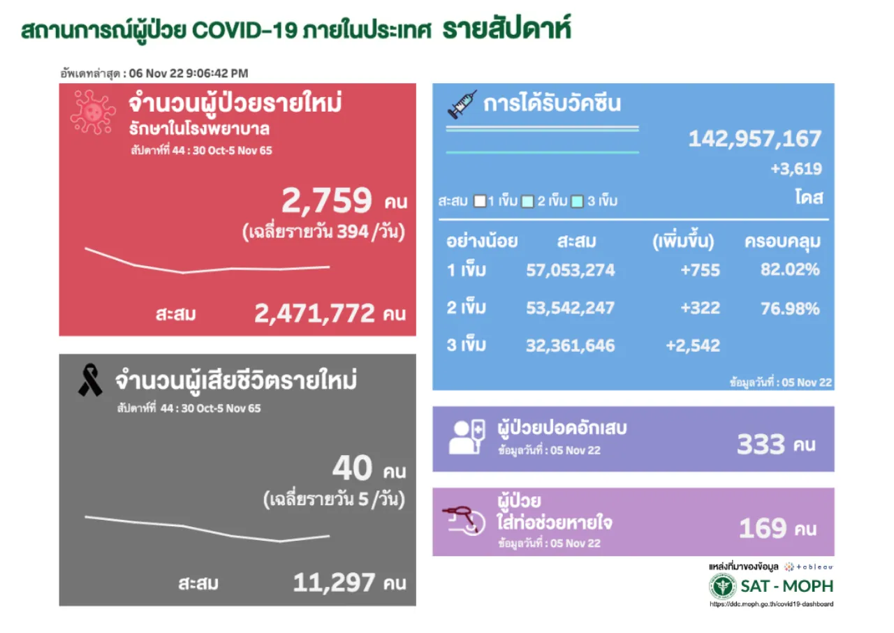 ทั้งนี้ สัปดาห์ที่ผ่านมา ช่วงวันที่ 30 ตุลาคม-5 พฤศจิกายน 2565 มีผู้ป่วยโควิด-19 รวม 2,759 ราย เฉลี่ย 394 รายต่อวัน เพิ่มขึ้นกว่า 2-3 สัปดาห์ก่อนประมาณ 4-5% ส่วนผู้ป่วยปอดอักเสบมี 333 ราย ใส่ท่อช่วยหายใจ 169 ราย และผู้เสียชีวิต 40 ราย เฉลี่ย 5 รายต่อวัน ยังไม่เพิ่มขึ้นจากเดิมมาก