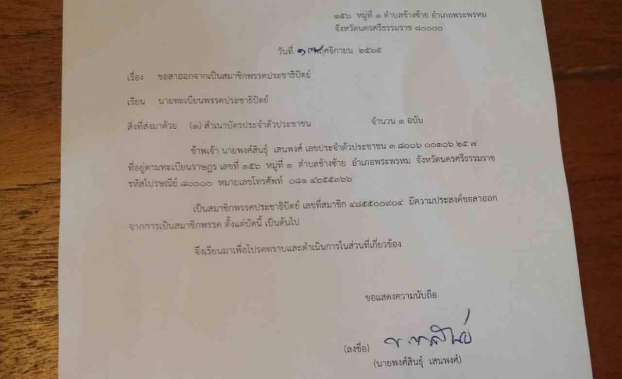 วันที่ 16 พ.ย. 2565 นายพงศ์สินธุ์ เสนพงศ์ น้องชายนายเทพไท เสนพงศ์ อดีต ส.ส.นครศรีธรรมราช พรรค ปชป.ได้เขียนหนังสือใบลาออกจากพรรค ปชป.เสร็จเรียบร้อยแล้ว มีข้อความดังนี้ เรื่อง ขอลาออกจากเป็นสมาชิกพรรคประชาธิปัตย์ เรียนนายทะเบียนพรรคประชาธิปัตย์ ข้าพเจ้า นายพงศ์สินธุ์ เสนพงศ์ ที่อยู่ตามทะเบียนราษฎร เลขที่ 156 หมู่ 1 ต.ช้างซ้าย อ.พระพรหม จ.นครศรีธรรมราช เป็นสมาชิกพรรคประชาธิปัตย์ เลขที่ 485500904 มีความประสงค์ ขอลาออกจากการเป็นสมาชิกพรรค ตั้งแต่บัดนี้เป็นต้นไป จึงเรียนมาเพื่อโปรดทราบและดำเนินการต่อไป ลงชื่อนายพงศ์สินธุ์ เสนพงศ์ ลงวันที่ 17 พ.ย. 2565