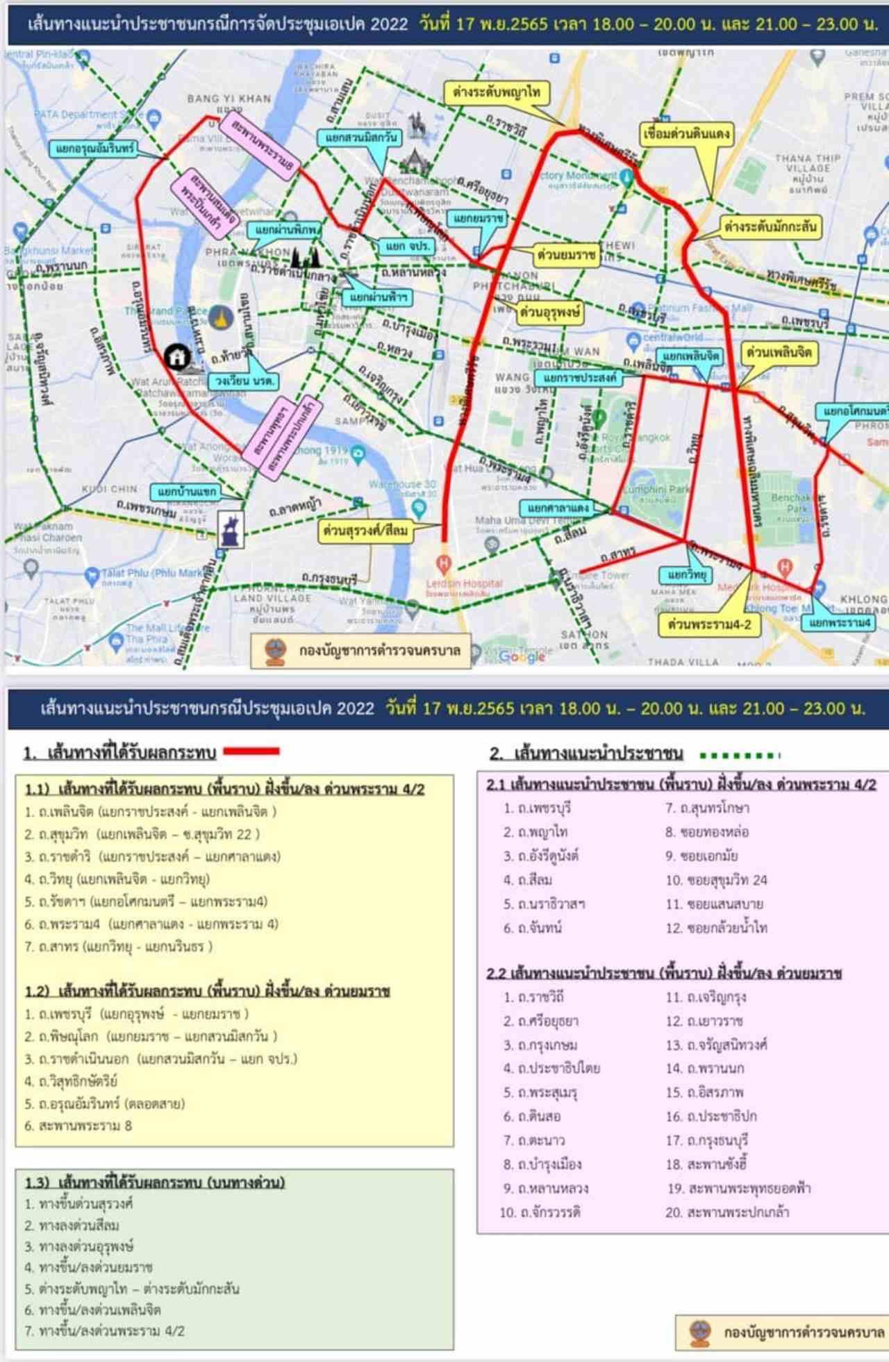 ทั้งนี้ กองบัญชาการตำรวจนครบาล ขอประชาสัมพันธ์เส้นทางให้ประชาชนหลีกเลี่ยง ในวันที่ 17 พ.ย. 2565 ในเวลา 18.00-20.00 น. และ 21.00-23.00 น. เนื่องจากจะมีงานเลี้ยงอาหารค่ำกาลาดินเนอร์ ที่หอประชุมกองทัพเรือ ให้แก่ผู้นำประเทศต่างๆ ที่มาร่วมประชุมเอเปก
