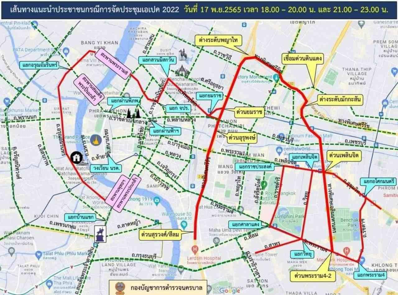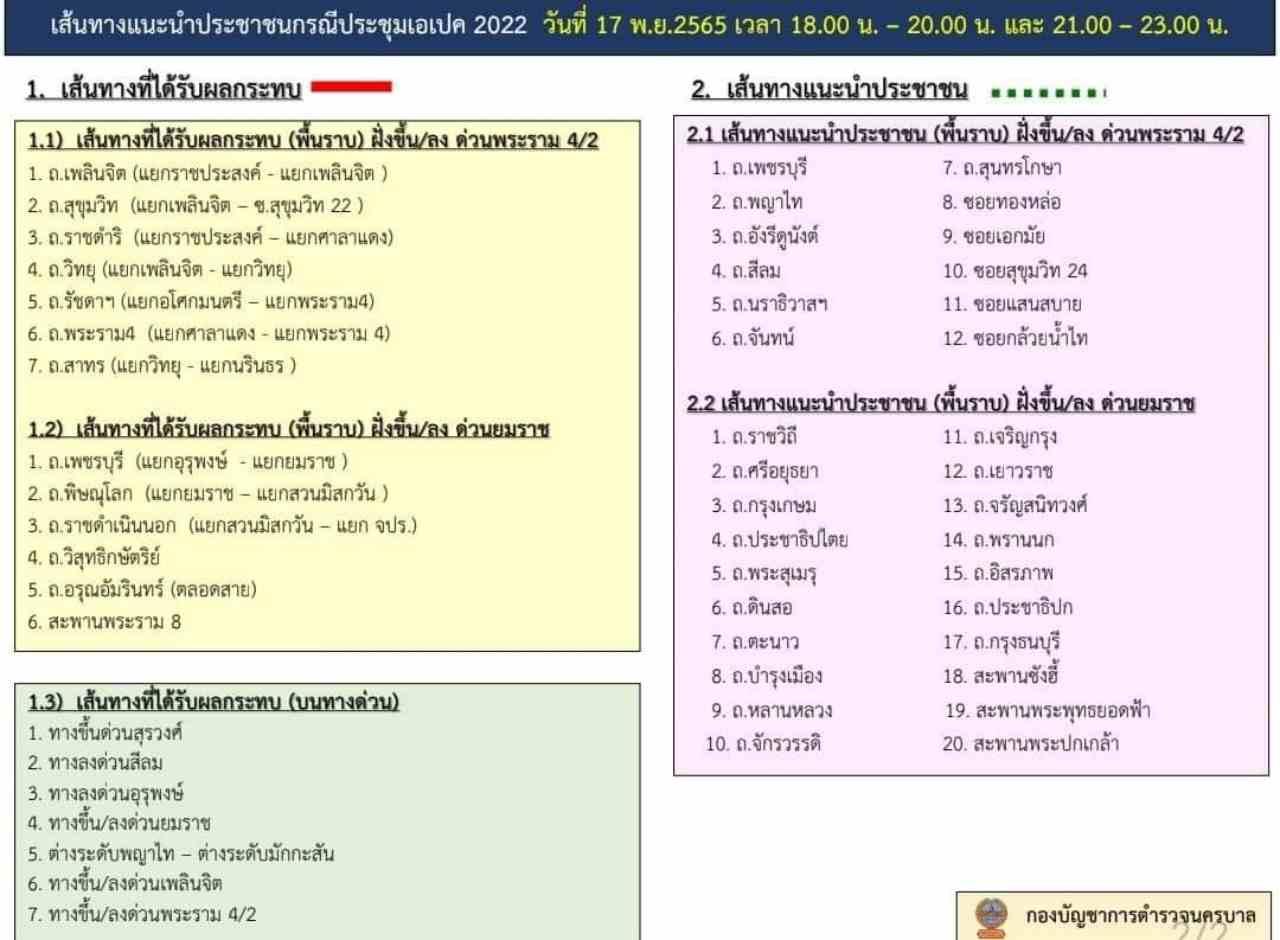 "บช.น. แจ้งหลีกเลี่ยงเส้นทางประชุม APEC 2022 วันนี้ (17 พ.ย. 65) เวลา 18.00-20.00 น. และ 21.00-23.00 น." ขณะ สน.ลุมพินี ขอความร่วมมือปิดทางเดิน skywalk ตั้งแต่แยกเฉลิมเผ่า ถึง หน้าอาคารมณียา 17-19 พ.ย. (ตลอด 24 ชั่วโมง)