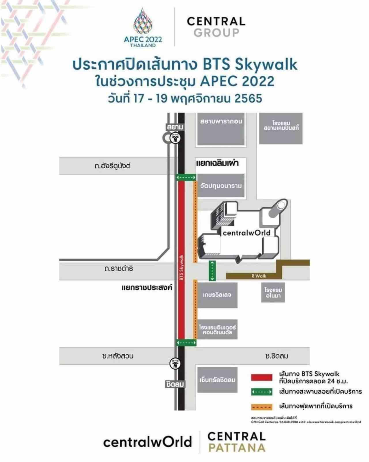 ทางสถานีตำรวจนครบาลลุมพินี และปทุมวัน ได้ขอความร่วมมือปิดทางเดิน skywalk ตั้งแต่แยกเฉลิมเผ่า (หน้าวัดปทุมวนารามฯ) จนถึง หน้าอาคารมณียา ตั้งแต่วันที่ 17-19 พฤศจิกายน 2565(ตลอด 24 ชั่วโมง) โดยยังสามารถใช้บันไดขึ้น-ลง หน้าอาคารมณียา และองค์การโทรศัพท์ (เดิม)ได้ ส่วนสถานีรถไฟฟ้าชิดลม เปิดให้บริการตามปกติ
