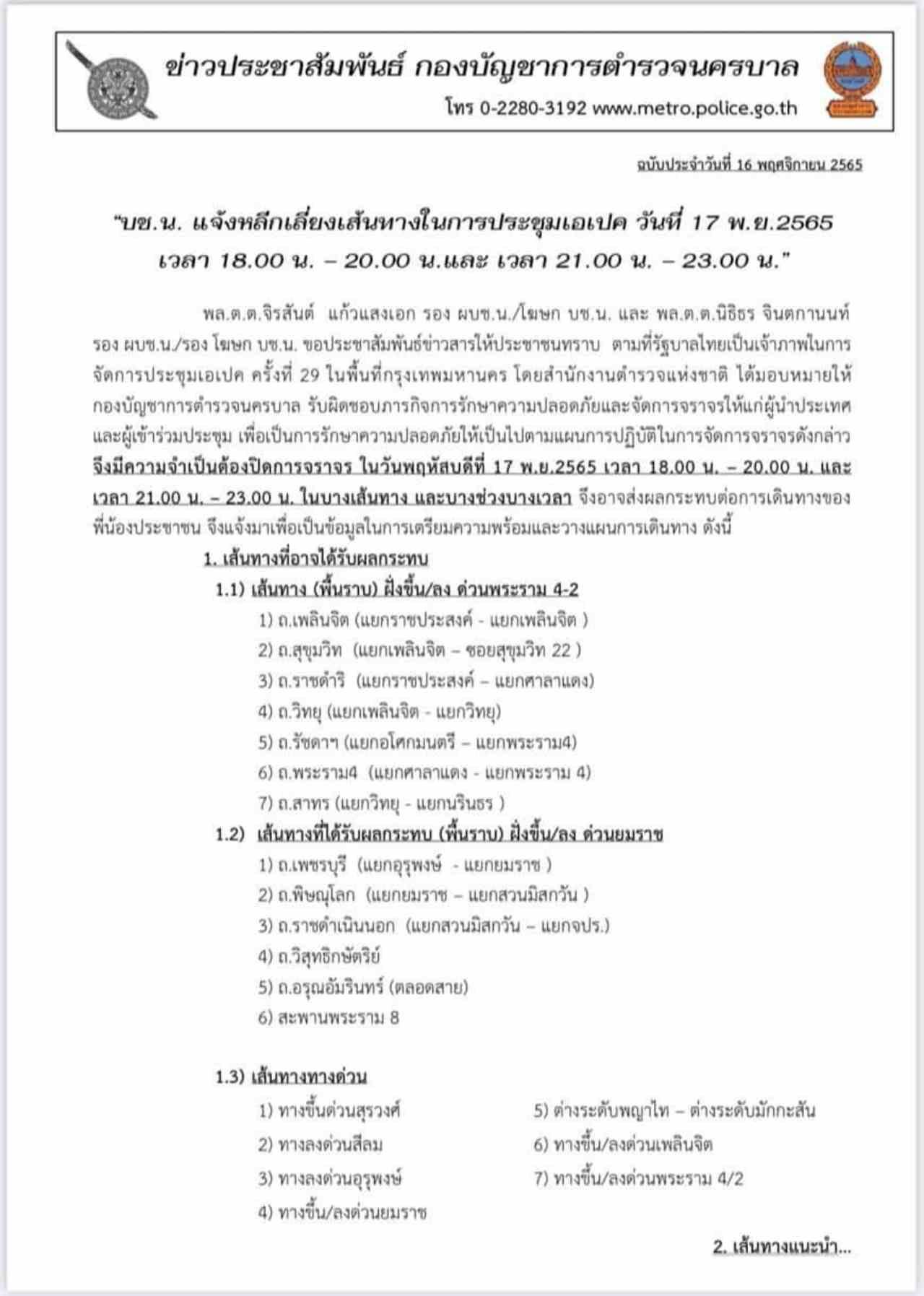 วันที่ 17 พ.ย. พล.ต.ต.จิรสันต์ แก้วแสงเอก รอง ผบช.น. และโฆษก บช.น. และ พล.ต.ต.นิธิธร จินตกานนท์ รอง ผบช.น. ในฐานะ รอง โฆษก บช.น. ขอประชาสัมพันธ์ข่าวสารให้ประชาชนทราบ ตามที่รัฐบาลไทยเป็นเจ้าภาพในการจัดการประชุมเอเปก ครั้งที่ 29 ในพื้นที่กรุงเทพมหานคร โดยสำนักงานตำรวจแห่งชาติ ได้มอบหมายให้กองบัญชาการตำรวจนครบาล รับผิดชอบภารกิจการรักษาความปลอดภัยและจัดการจราจรให้แก่ผู้นำประเทศและผู้เข้าร่วมประชุม เพื่อเป็นการรักษาความปลอดภัยให้เป็นไปตามแผนการปฏิบัติในการจัดการจราจรดังกล่าว
