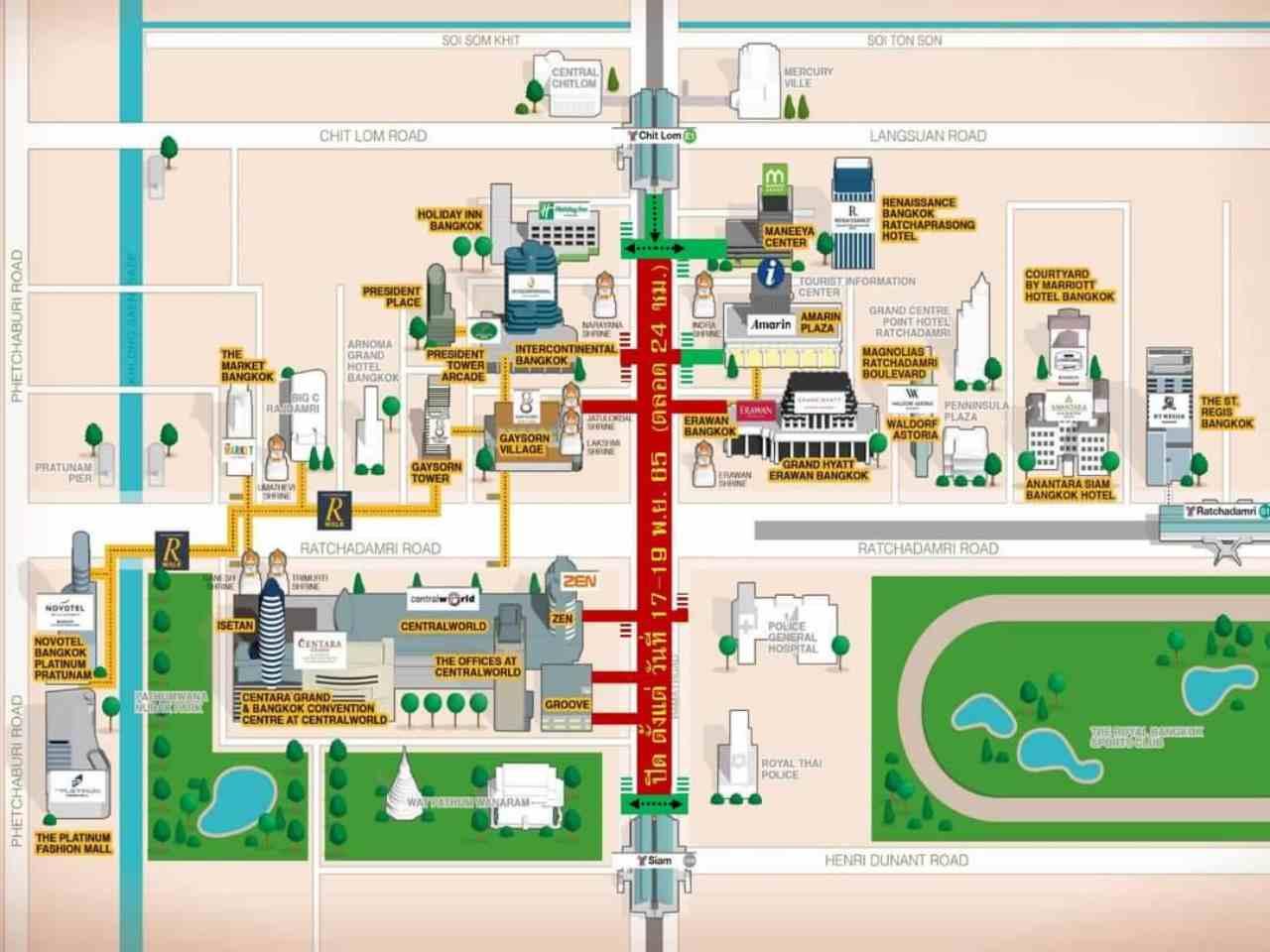 1) ถ.เพลินจิต (แยกราชประสงค์ - แยกเพลินจิต ) 2) ถ.สุขุมวิท (แยกเพลินจิต - ซอยสุขุมวิท 22) 3) ถ.ราชดําริ (แยกราชประสงค์ - แยกศาลาแดง) 4) ถ.วิทยุ (แยกเพลินจิต - แยกวิทยุ) 5) ถ.รัชดาฯ (แยกอโศกมนตรี - แยกพระราม4) 6) ถ.พระราม4 (แยกศาลาแดง - แยกพระราม 4)