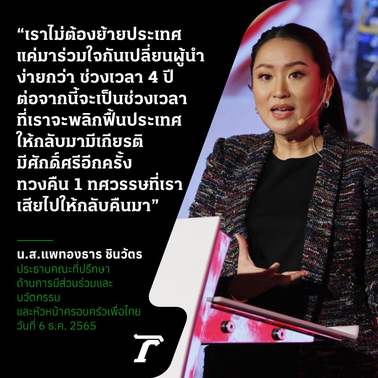 วันที่ 6 ธ.ค. 2565 นางสาวแพทองธาร ชินวัตร ประธานคณะที่ปรึกษาด้านการมีส่วนร่วมและนวัตกรรม พรรคเพื่อไทย และหัวหน้าครอบครัวเพื่อไทย กล่าวในการประชุมใหญ่วิสามัญ ประจำปี 2565 ว่า ในช่วง 1 ปีที่ผ่านมา ตนเองพร้อมคณะกรรมการลงพื้นที่ศึกษาและทำวิจัย พบว่าประเทศถอยหลังไปมาก ทั้งทางเศรษฐกิจ การเมือง สังคม และไร้ที่ยืนบนเวทีโลก ประชาชนจำนวนมากมีหนี้ท่วมท้นและสะสมเป็นเวลานาน ปัญหาต่างๆ ที่เกิดขึ้นในปัจจุบัน จำเป็นต้อง “คิดใหญ่” เพราะหากคิดเล็กจะรับมือปัญหามากมายขนาดนี้ไม่อยู่ และต้อง “ทำเป็น” เพื่อให้สามารถแก้ปัญหาได้ โดยยืนยันได้จากผลงานตั้งแต่รัฐบาลไทยรักไทย จนถึงรัฐบาล นางสาวยิ่งลักษณ์ ชินวัตร อดีตนายกรัฐมนตรี ว่าเราสามารถคืนความสุข ความเจริญ ความกินดีอยู่ดีให้พี่น้องประชาชนได้