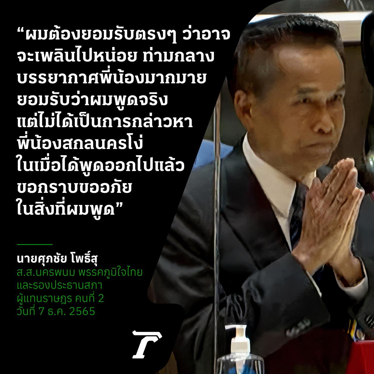 ก่อนที่จะเปิดโอกาสให้ นายศุภชัย กล่าว โดยเจ้าตัวระบุขอใช้เวลาสั้นๆ ยอมรับว่าวันที่ 4 ธ.ค. 2565 ที่ผ่านมา มีโอกาสปราศรัยหาเสียงเปิดตัวว่าที่ผู้สมัคร ส.ส.พรรคภูมิใจไทย ที่นครพนม และเป็นคนขึ้นปราศรัยหาเสียงด้วย “แต่ในขณะที่ปราศรัยอยู่นั้น ผมต้องยอมรับตรงๆ ครับว่าผมอาจจะเพลินไปหน่อย ท่ามกลางบรรยากาศที่พี่น้องมากมาย ก็คงจะยืนยันกับท่านประธานและท่านสมาชิกว่า คำพูดที่ท่านสมาชิกทั้ง 2 ท่านได้พูดถึงนั้น ยอมรับในสภาฯ ครับว่าผมได้พูดจริง แต่ผมไม่ได้หมายถึงว่าเป็นการกล่าวหาพี่น้อง จ.สกลนคร โง่ อยากจะให้ทั้ง 2 ท่านไปเปิดคลิปดูใหม่ก็ได้ แต่ถึงอย่างไรก็ตาม ยืนยันว่าในวันนั้นผมปราศรัยกับพี่น้องประชาชนในฐานะที่เป็นว่าที่ผู้สมัคร ส.ส.ของพรรคภูมิใจไทย ไม่ได้ปราศรัยในฐานะที่เป็น ส.ส. หรือรองประธานสภาผู้แทนราษฎร แต่ในเมื่อตัวผมได้พูดออกไปแล้ว พลาดพลั้งไปแล้ว หรือผิดไปแล้ว ผมยอมรับกับท่านประธาน ฝากไปถึงท่านสมาชิกของ 12 ท่าน และทุกๆ ท่านที่เกี่ยวข้องด้วยว่า ผมขอกราบขออภัยในสิ่งที่ผมพูดขึ้นมา และกราบขอโทษเพื่อนๆ ขอกราบขอโทษครับ” โดยนายศุภชัย ได้ยกมือขึ้นพนมมือพร้อมกับกล่าวคำขอโทษด้วย.