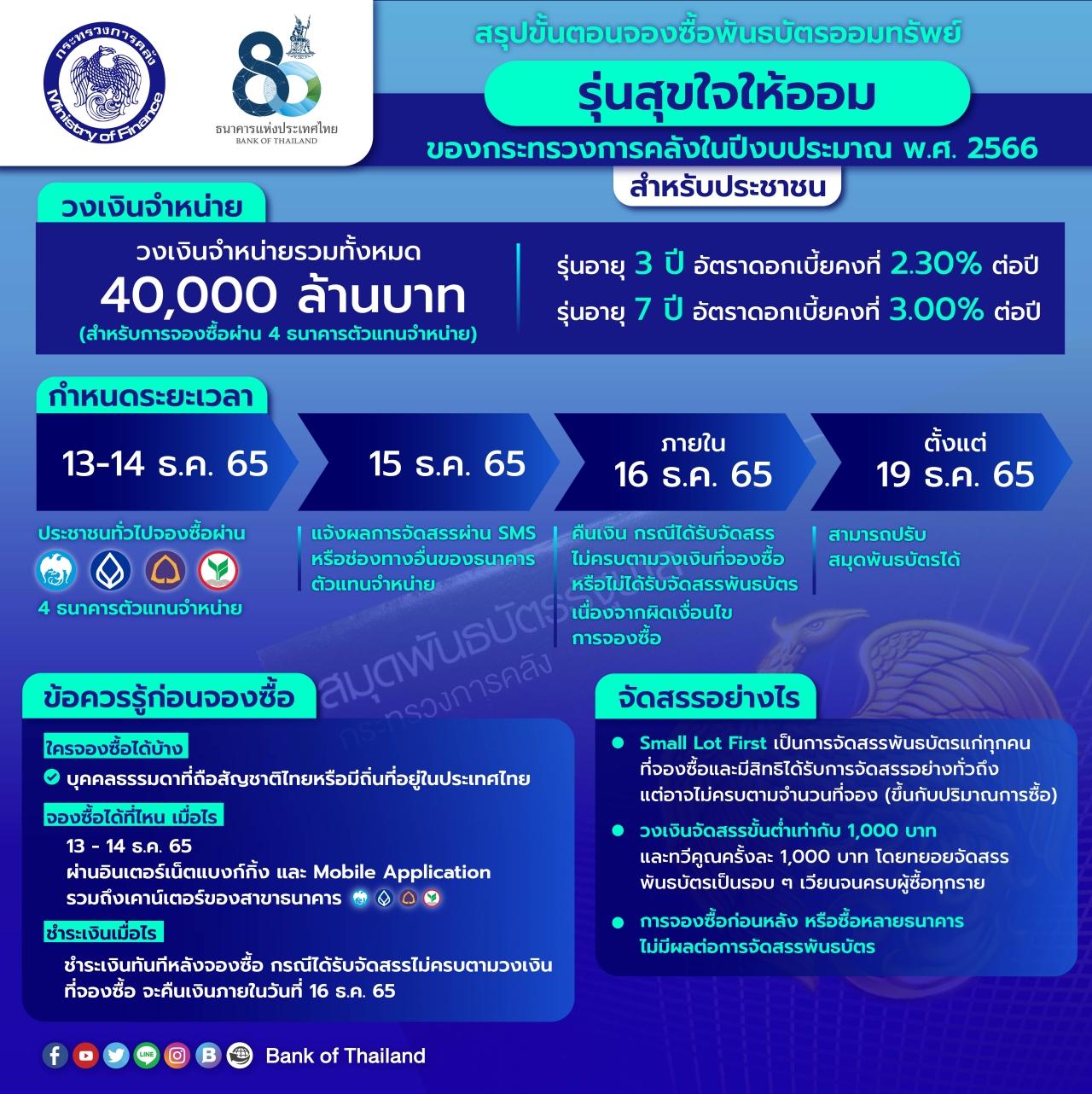 1. ประชาชนทั่วไป จองซื้อได้ระหว่างวันที่ 13-14 ธ.ค. 2565 วงเงิน 40,000 ล้านบาท ไม่จำกัดวงเงินจองซื้อ โดยสํานักงานบริหารหนี้สาธารณะ (สบน.) จะจัดสรรแบบ Small Lot First ซึ่งผู้จองซื้อจะได้รับจัดสรรพันธบัตร มี 2 รุ่นอายุ ได้แก่