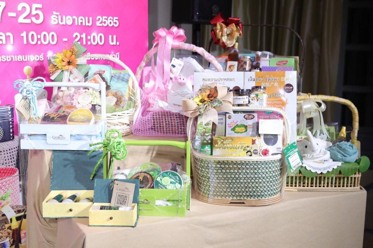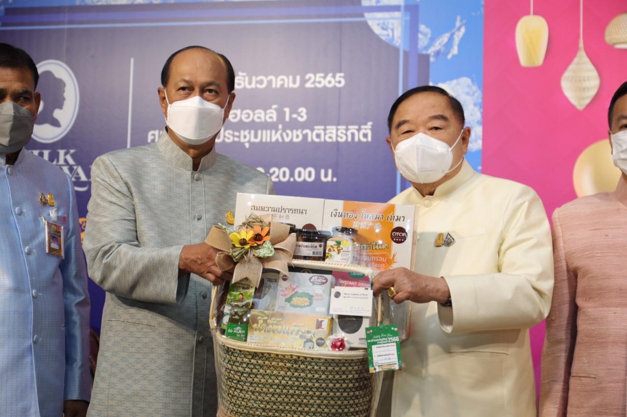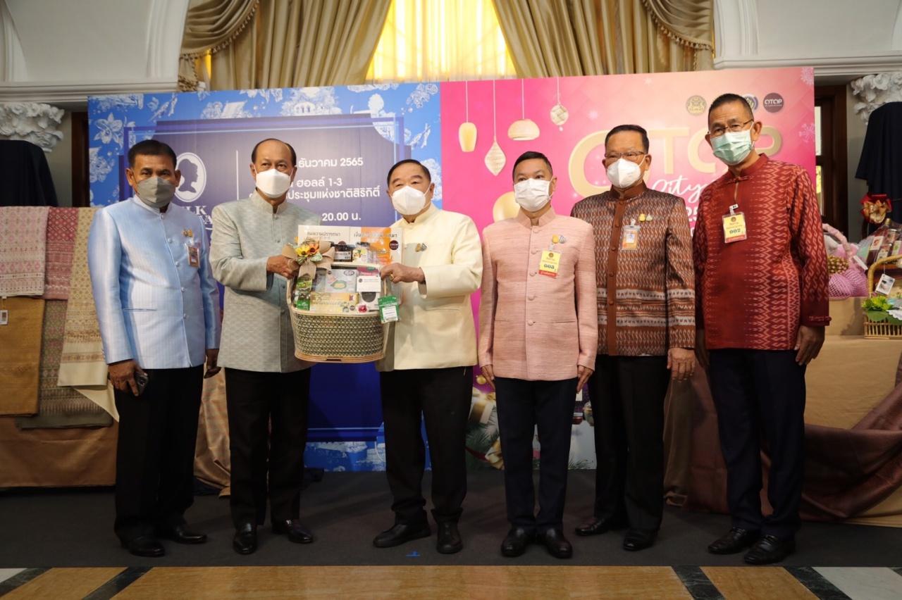 วันที่ 13 ธันวาคม 2565 ที่ ทำเนียบรัฐบาล ก่อนเริ่มการประชุมคณะรัฐมนตรี พลเอก ประวิตร วงษ์สุวรรณ รองนายกรัฐมนตรี พร้อมด้วย พลเอก อนุพงษ์ เผ่าจินดา รัฐมนตรีว่าการกระทรวงมหาดไทย นายทรงศักดิ์ ทองศรี รัฐมนตรีช่วยว่าการกระทรวงมหาดไทย และคณะรัฐมนตรี ร่วมเยี่ยมชมการจัดแสดงกระเช้าของขวัญปีใหม่จากผลิตภัณฑ์ OTOP มรดกภูมิปัญญาของคนไทย อาทิ กระเช้าจากกลุ่มหัตถกรรมบ้านมอญต้นฝ้าย จังหวัดเชียงใหม่, กระเช้าของขวัญสุคันธา จังหวัดเพชรบุรี, กระเช้าของขวัญกลุ่มชลบุรีตะวันออกหมูหยอง จังหวัดชลบุรี, ชุดกิฟต์เซตสปาชัยศิขริน (CHAISIKARIN) จังหวัดลำพูน และผ้าไหม ผ้าทอมือ ผ้าหมี่ขิด จากจังหวัดอุดรธานี ชัยภูมิ ราชบุรี ผ้าไหมแพรวา จากจังหวัดกาฬสินธุ์ เป็นต้น ซึ่งเป็นส่วนหนึ่งของการประชาสัมพันธ์การจัดงาน OTOP City 2022 “มอบความสุขจากภูมิปัญญา ส่งต่อคุณค่าจากฝีมือคนไทย” ระหว่างวันที่ 17-25 ธันวาคม 2565 ที่อาคารชาเลนเจอร์ อิมแพ็ค เมืองทองธานี และการจัดงานเทศกาลไหมไทย 2565 (Thai Silk Festival 2022) ระหว่างวันที่ 15-18 ธันวาคม 2565 ที่ศูนย์ประชุมแห่งชาติสิริกิติ์ โดยมีนายชัยวัฒน์ ชื่นโกสุม รองปลัดกระทรวงมหาดไทย นายอรรษิษฐ์ สัมพันธรัตน์ อธิบดีกรมการพัฒนาชุมชน นายสุรศักดิ์ อักษรกุล รองอธิบดีกรมการพัฒนาชุมชน นายวรงค์ แสงเมือง ผู้อำนวยการสำนักส่งเสริมภูมิปัญญาท้องถิ่นและวิสาหกิจชุมชน นำเยี่ยมชม