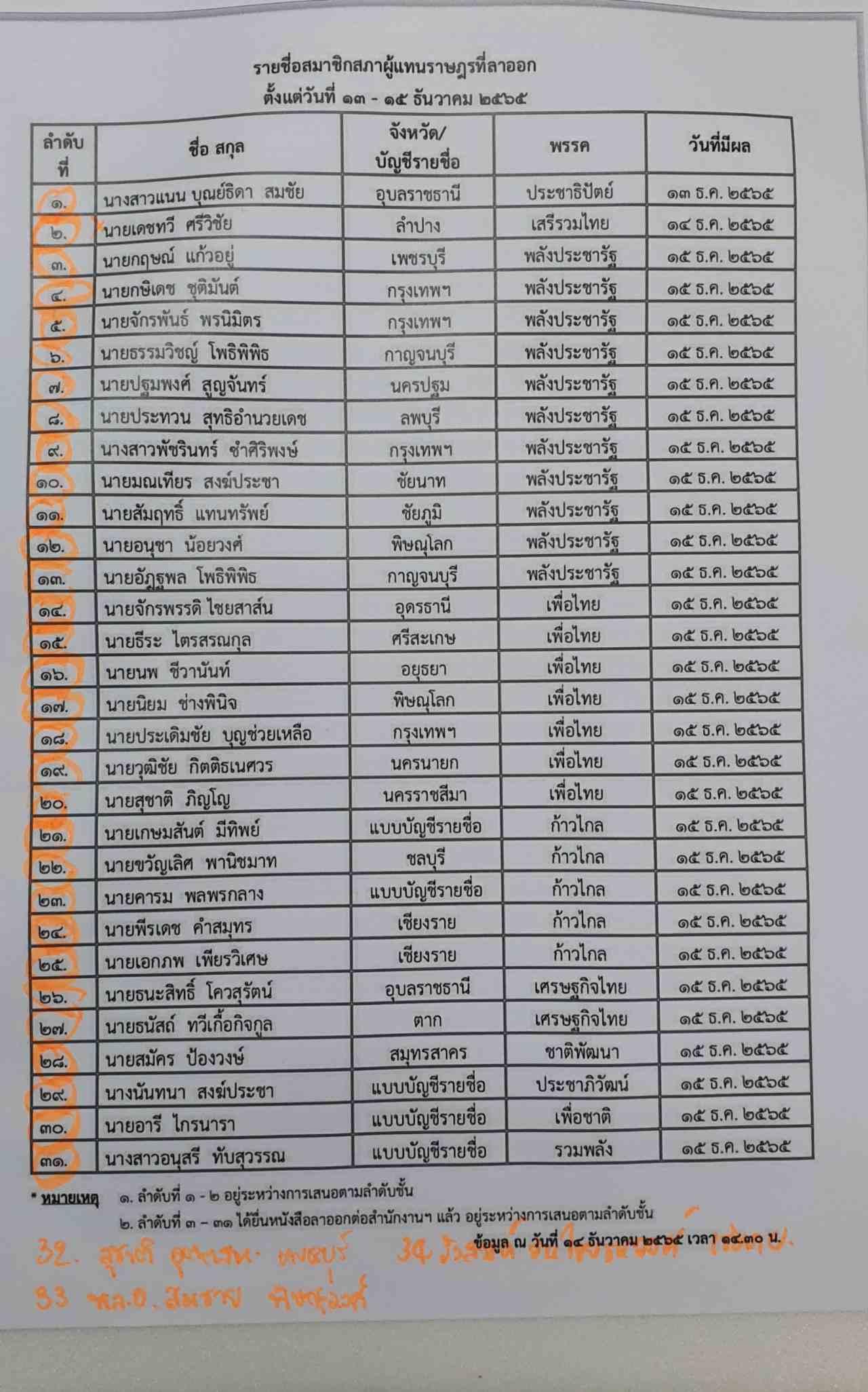 รายชื่อ สมาชิกสภาผู้แทนราษฎร ทยอยลาออกตั้งแต่วันที่ 13-16 ธ.ค. 2565 จำนวน 34 คน ประกอบด้วย