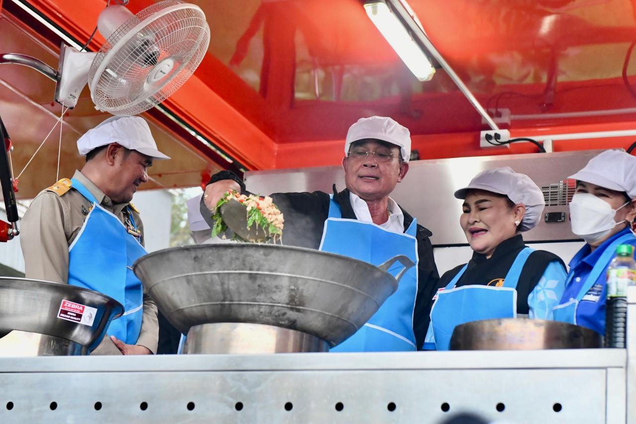 จากนั้น นายกฯ เดินจับมือทักทายประชาชน และได้เดินไปยังโรงครัวพระราชทาน สวมผ้ากันเปื้อน หมวกเชฟ ทำผัดกะเพราไก่และไข่เจียวแจกผู้ประสบภัย ทั้งนี้ระหว่างที่นายกฯ ผัดกระเพรา ผู้สื่อข่าวถามว่า นายกฯ มีสูตรเด็ดกะเพราหรือไม่ นายกฯ กล่าวตอบว่า “เครื่องปรุงใส่ตามปกติ แต่ที่ใส่เพิ่มไปคือหัวใจ ความรักและหัวใจ” นอกจากนี้นายกฯ ยังกล่าวอวยพรว่า ใครกินไปขอให้สุขภาพแข็งแรง มีความสุข มีความรักซึ่งกันและกัน หมดทุกข์หมดโศกหมดโรคหมดภัย คิดสิ่งใดก็ขอให้สมปรารถนา และให้ปีใหม่ที่ใกล้จะถึงเป็นปีแห่งความสงบสุขของบ้านเมือง เป็นปีแห่งความรัก ความสามัคคีของคนในชาติ เพื่อชาติ ศาสน์ กษัตริย์ และประชาชนที่รักของเรา นายกฯ ใส่หัวใจของนายกฯ ลงไปในนี้ เคี้ยวให้ระวังหน่อยนะ