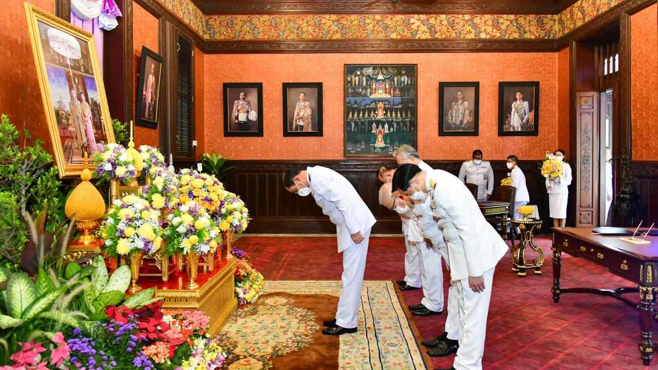 นายกรัฐมนตรีและภริยาถวายความเคารพพระบรมฉายาลักษณ์พระบาทสมเด็จพระเจ้าอยู่หัว และสมเด็จพระนางเจ้าฯ พระบรมราชินี แล้วทูลเกล้าฯ ถวายแจกันดอกไม้เบื้องหน้าพระบรมฉายาลักษณ์ฯ ดังนี้