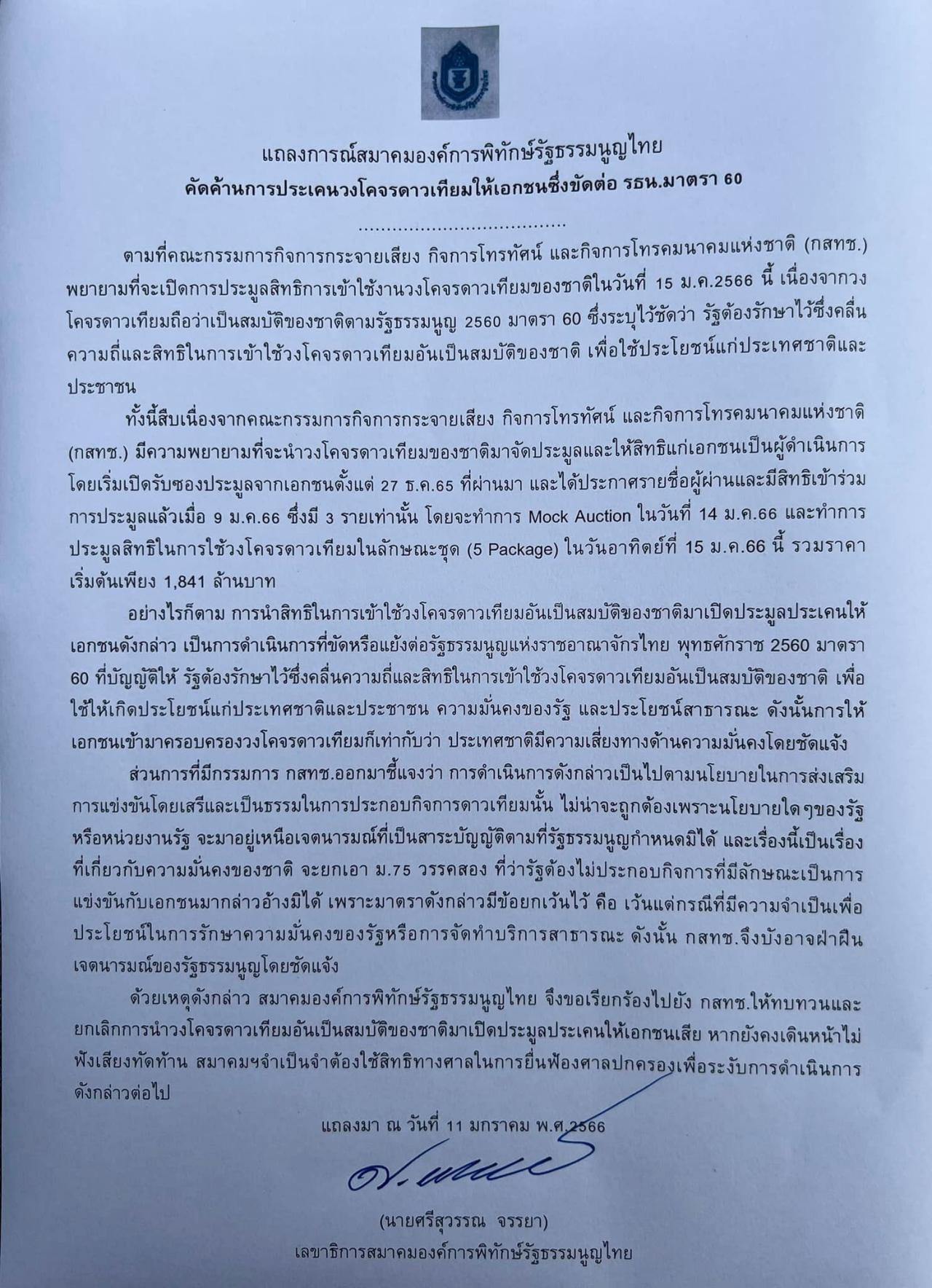 วันที่ 11 ม.ค. 2566 นายศรีสุวรรณ จรรยา เลขาธิการสมาคมองค์การพิทักษ์รัฐธรรมนูญไทย ออกแถลงการณ์คัดค้าน คณะกรรมการกิจการกระจายเสียง กิจการโทรทัศน์ และกิจการโทรคมนาคมแห่งชาติ (กสทช.) ที่พยายามเปิดการประมูลสิทธิการเข้าใช้งานวงโคจรดาวเทียมของชาติในวันที่ 15 ม.ค. 2566 เนื่องจากวงโคจรดาวเทียมถือเป็นสมบัติของชาติ ตามรัฐธรรมนูญแห่งราชอาณาจักรไทย พุทธศักราช 2560 มาตรา 60 ซึ่งระบุไว้ชัดว่า รัฐต้องรักษาไว้ซึ่งคลื่นความถี่และสิทธิในการเข้าใช้วงโคจรดาวเทียมอันเป็นสมบัติของชาติ เพื่อใช้ประโยชน์แก่ประเทศชาติและประชาชน ความมั่นคงของรัฐ และประโยชน์สาธารณะ