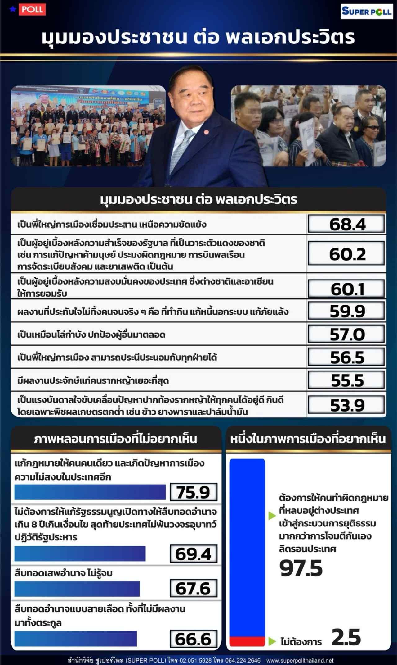 โพล ชี้ มุมมองประชาชน ต่อ "บิ๊กป้อม" พบคนมอง เป็นพี่ใหญ่การเมือง ประสานประนีประนอม อยู่เบื้องหลังรัฐบาล-ความสงบ ขณะภาพหลอนคนไม่อยากให้เกิดอีก "แก้กฎหมายให้คนคนเดียว"